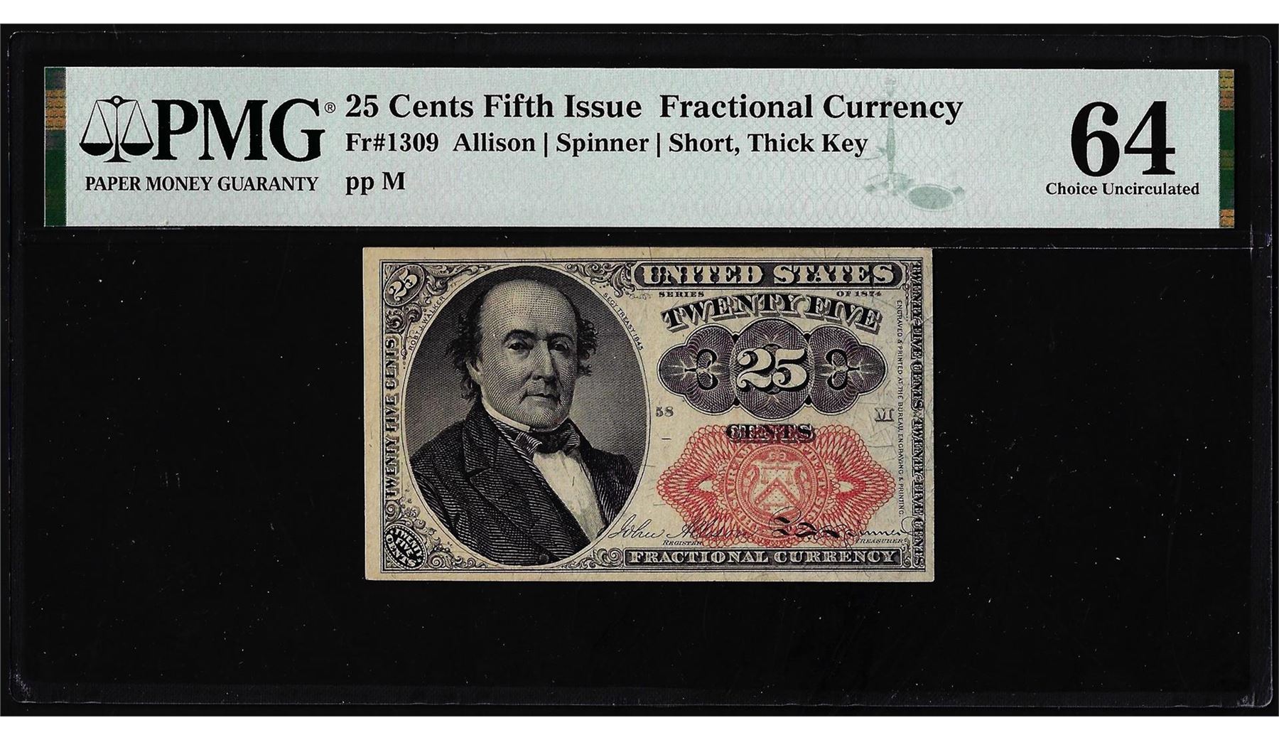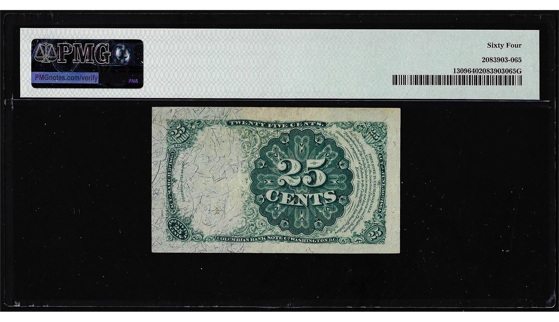 One 1874 25 Cent Fractional Currency Note Fr.1309 PMG Choice Uncirculated 64. PMG Certified.
