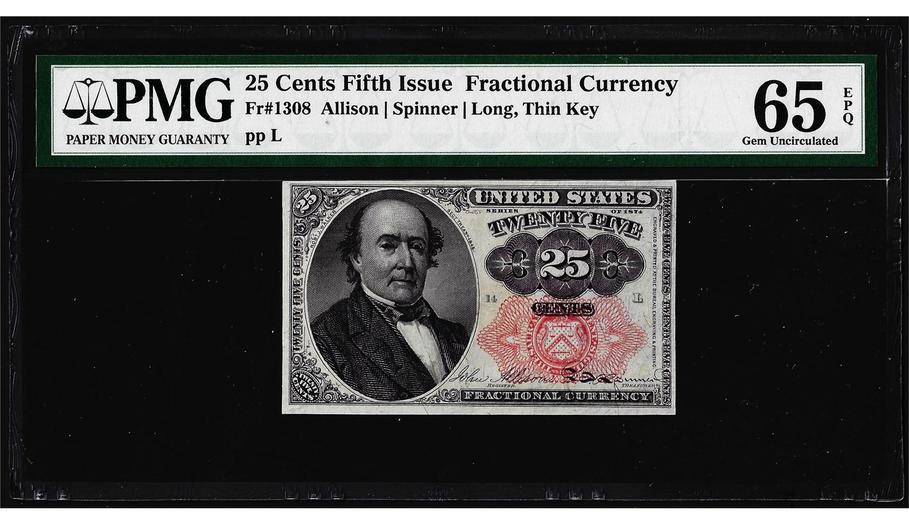 One 1874 25 Cents Fifth Issue Fractional Currency Note Fr.1308 PMG Gem Uncirculated 65EPQ. PMG Certified.