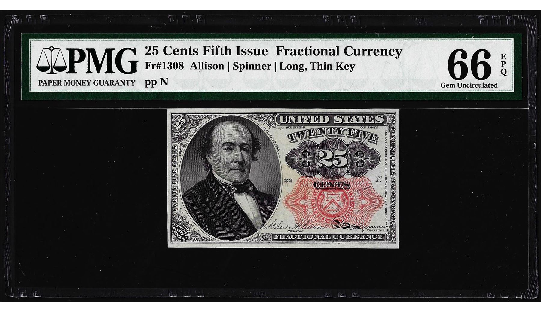 One 1874 25 Cents Fifth Issue Fractional Currency Note Fr.1308 PMG Gem Uncirculated 66EPQ. PMG Certified.