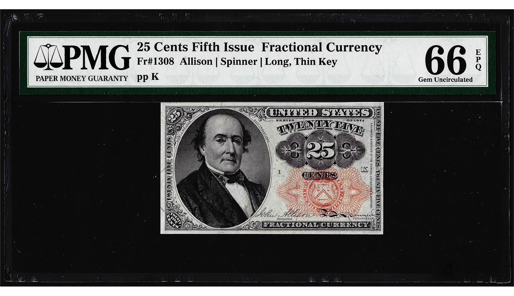One 1874 25 Cents Fifth Issue Fractional Currency Note Fr.1309 PMG Gem Uncirculated 66EPQ. PMG Certified.