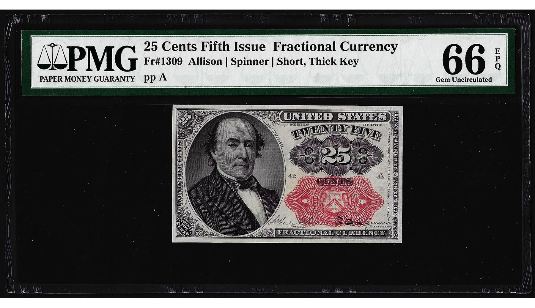 One 1874 25 Cents Fifth Issue Fractional Currency Note Fr.1309 PMG Gem Uncirculated 66EPQ. PMG Certified.