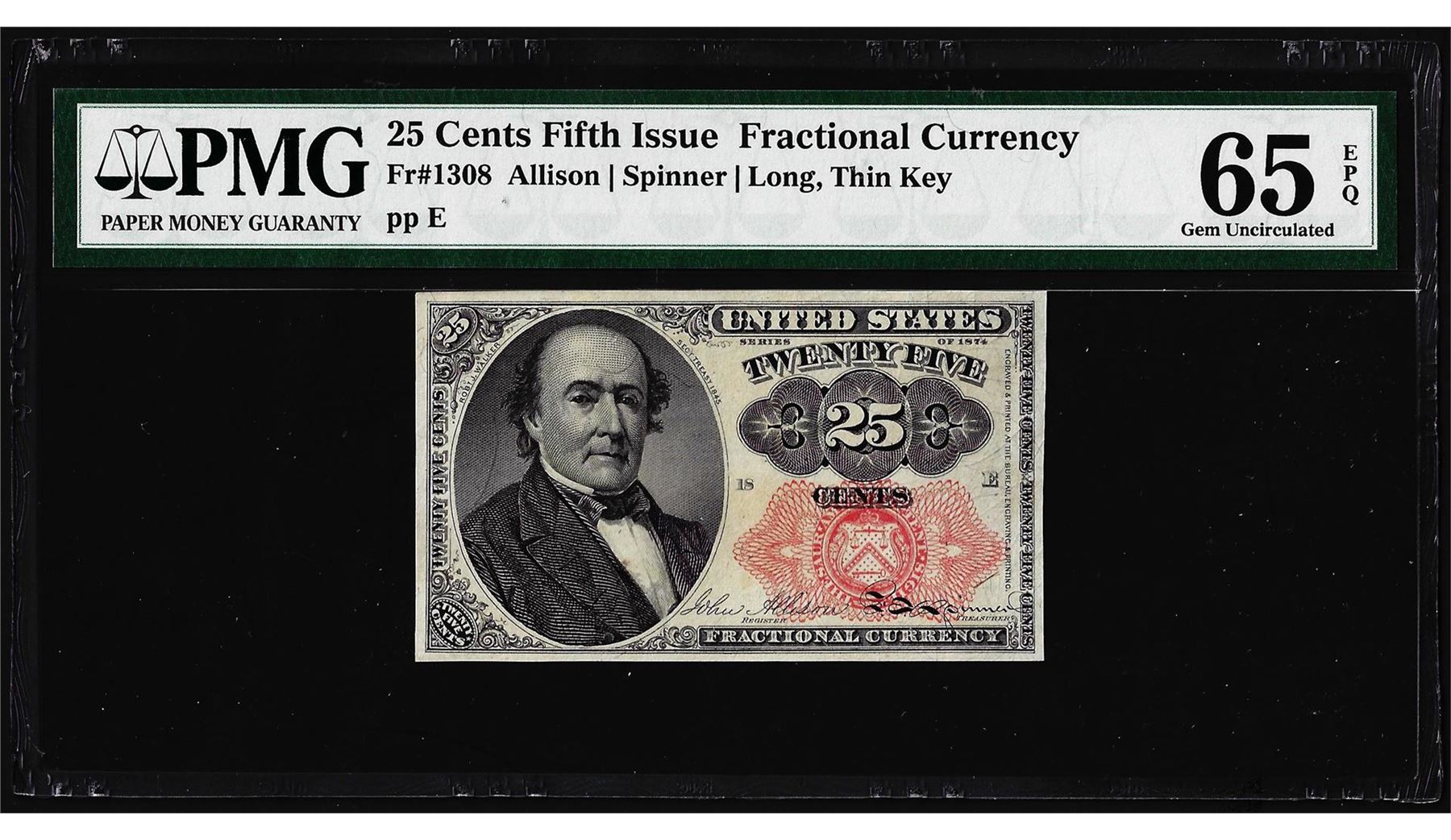 One 1874 25 Cents Fifth Issue Fractional Currency Note Fr.1309 PMG Gem Uncirculated 65EPQ. PMG Certified.