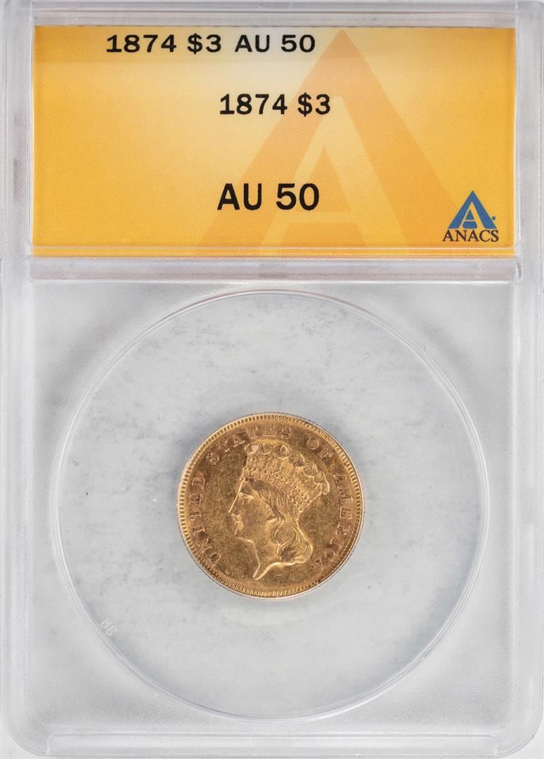 One 1874 $3 Indian Princess Head Gold Coin ANACS AU50. ANACS Certified.