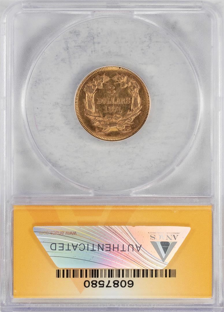 One 1874 $3 Indian Princess Head Gold Coin ANACS AU50. ANACS Certified.