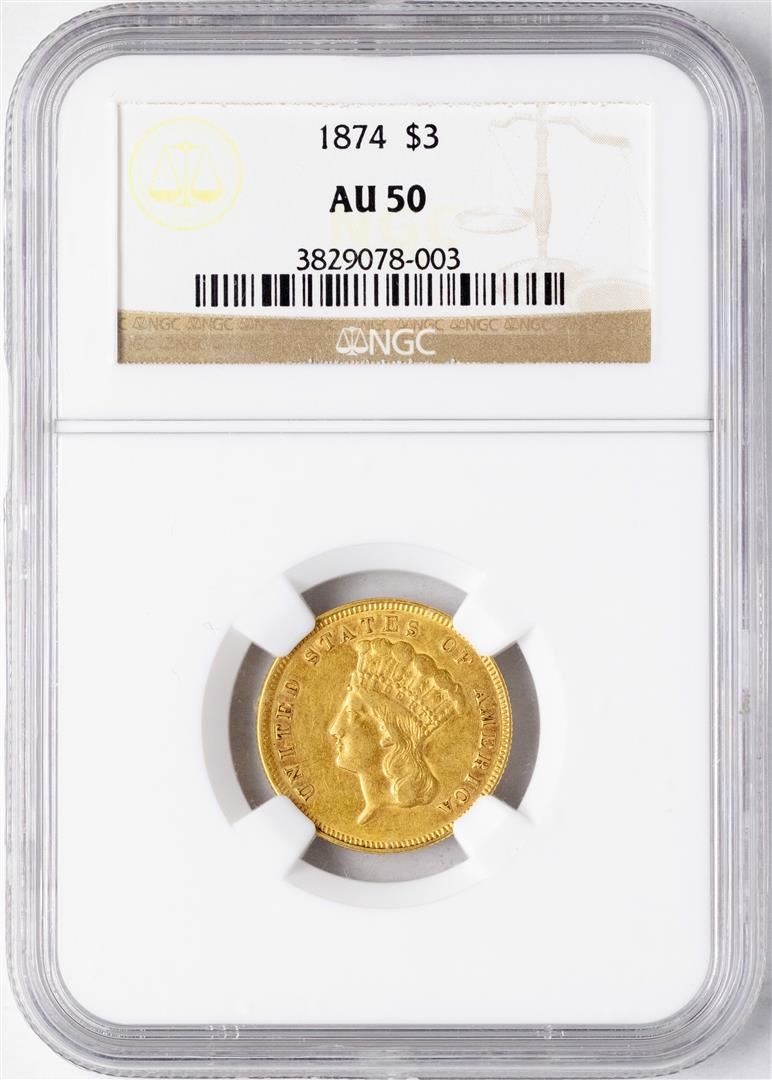One 1874 $3 Indian Princess Head Gold Coin NGC AU50. NGC Certified.
