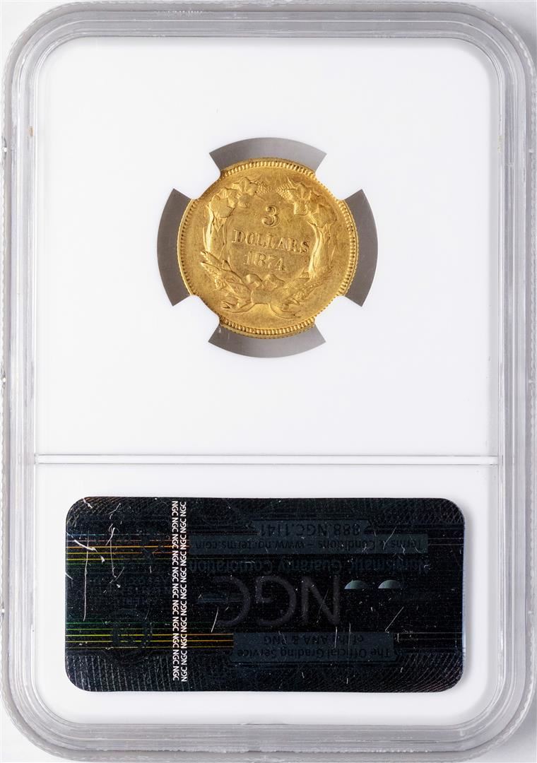 One 1874 $3 Indian Princess Head Gold Coin NGC AU50. NGC Certified.