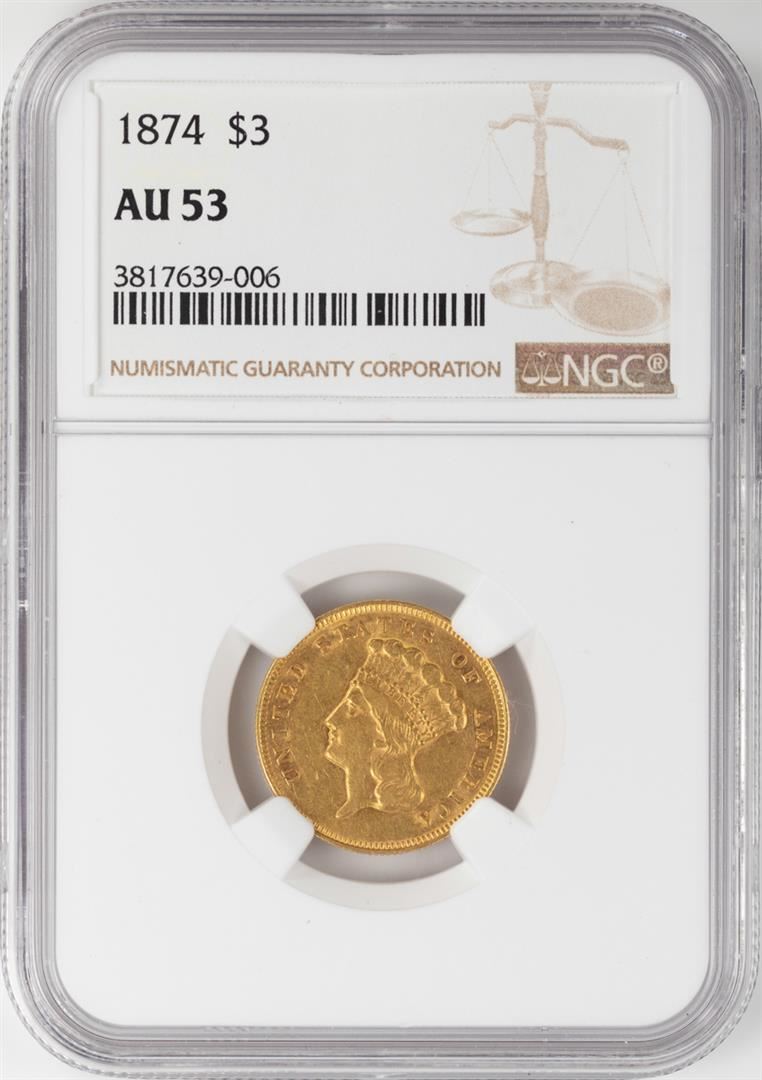 One 1874 $3 Indian Princess Head Gold Coin NGC AU53. NGC Certified.