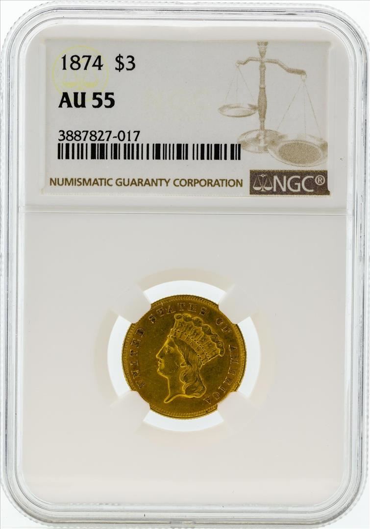One 1874 $3 Indian Princess Head Gold Coin NGC AU55. NGC Certified.