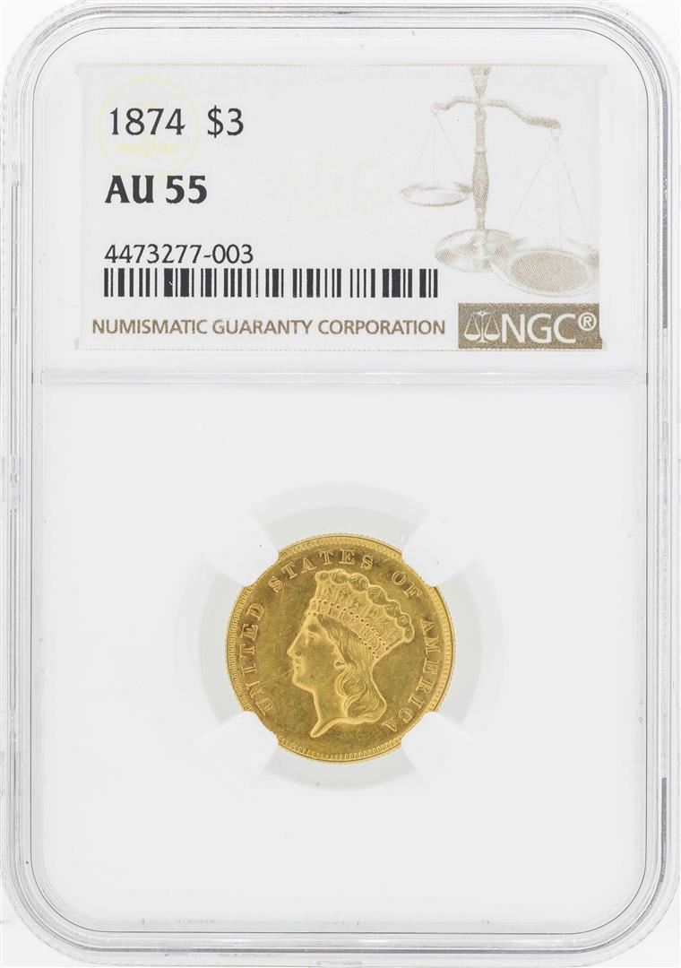 1874 $3 Indian Princess Head Gold Coin NGC AU55