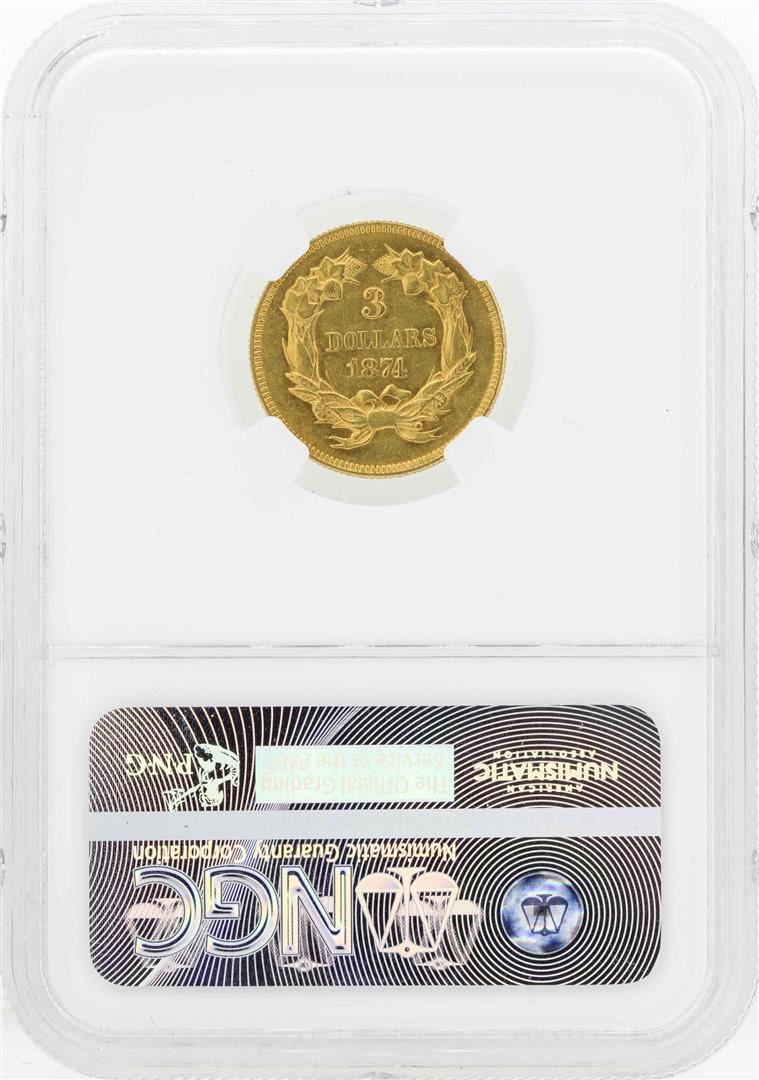 One 1874 $3 Indian Princess Head Gold Coin NGC AU55. NGC Certified.