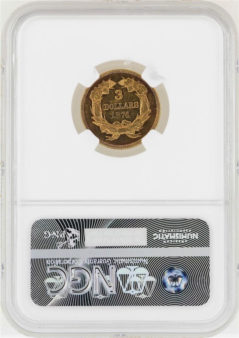One 1874 $3 Indian Princess Head Gold Coin NGC AU55. NGC Certified.