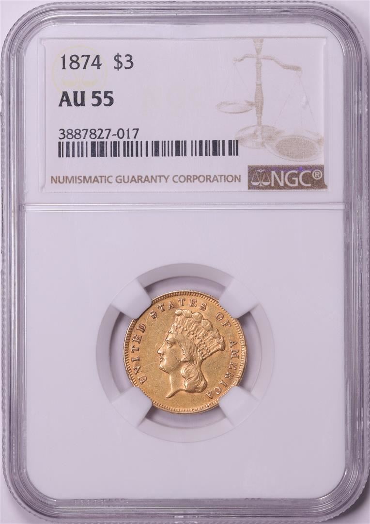 One 1874 $3 Indian Princess Head Gold Coin NGC AU55. NGC Certified.