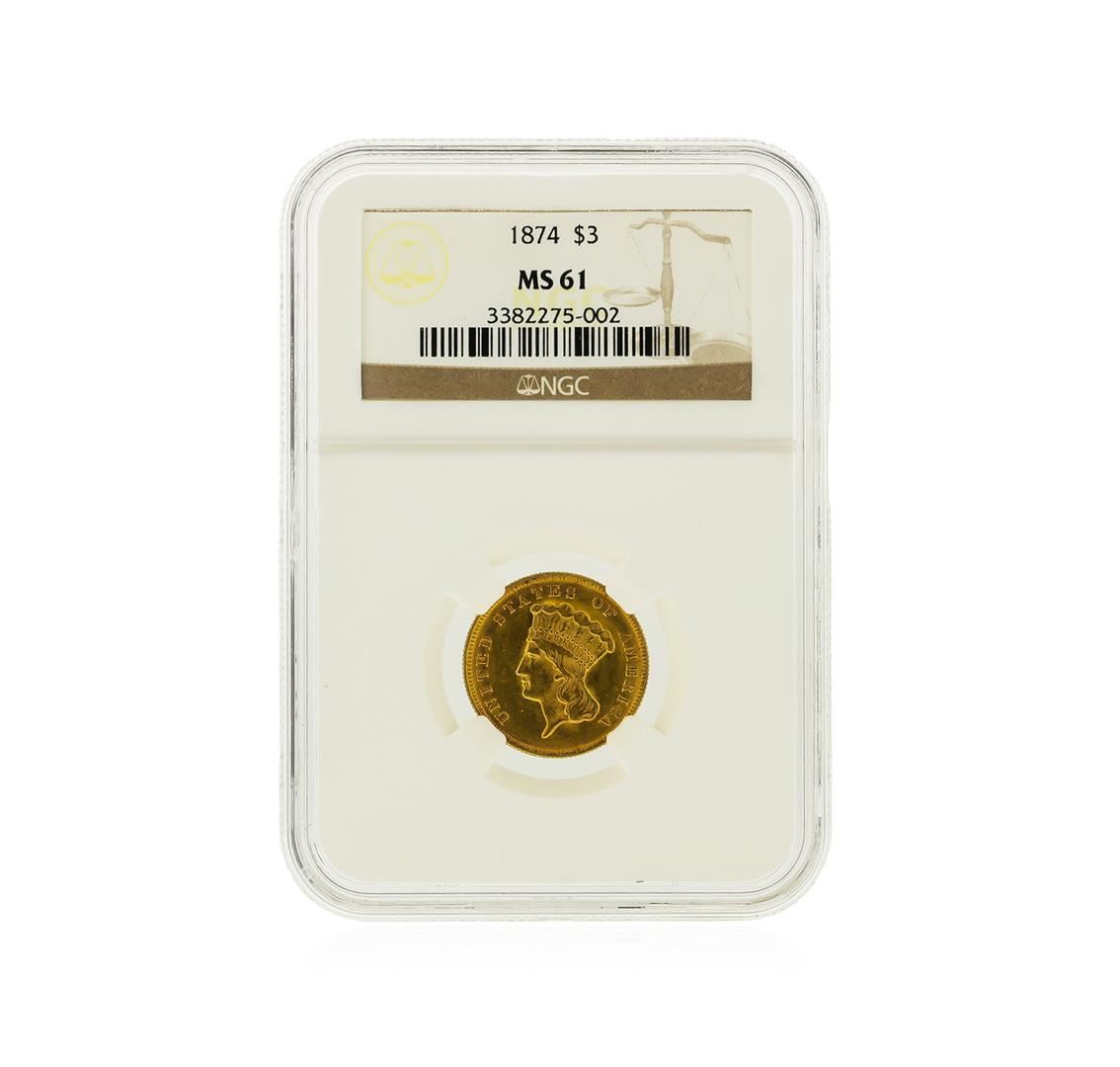 One 1874 $3 Indian Princess Head Gold Coin NGC Graded MS61. NGC Certified.