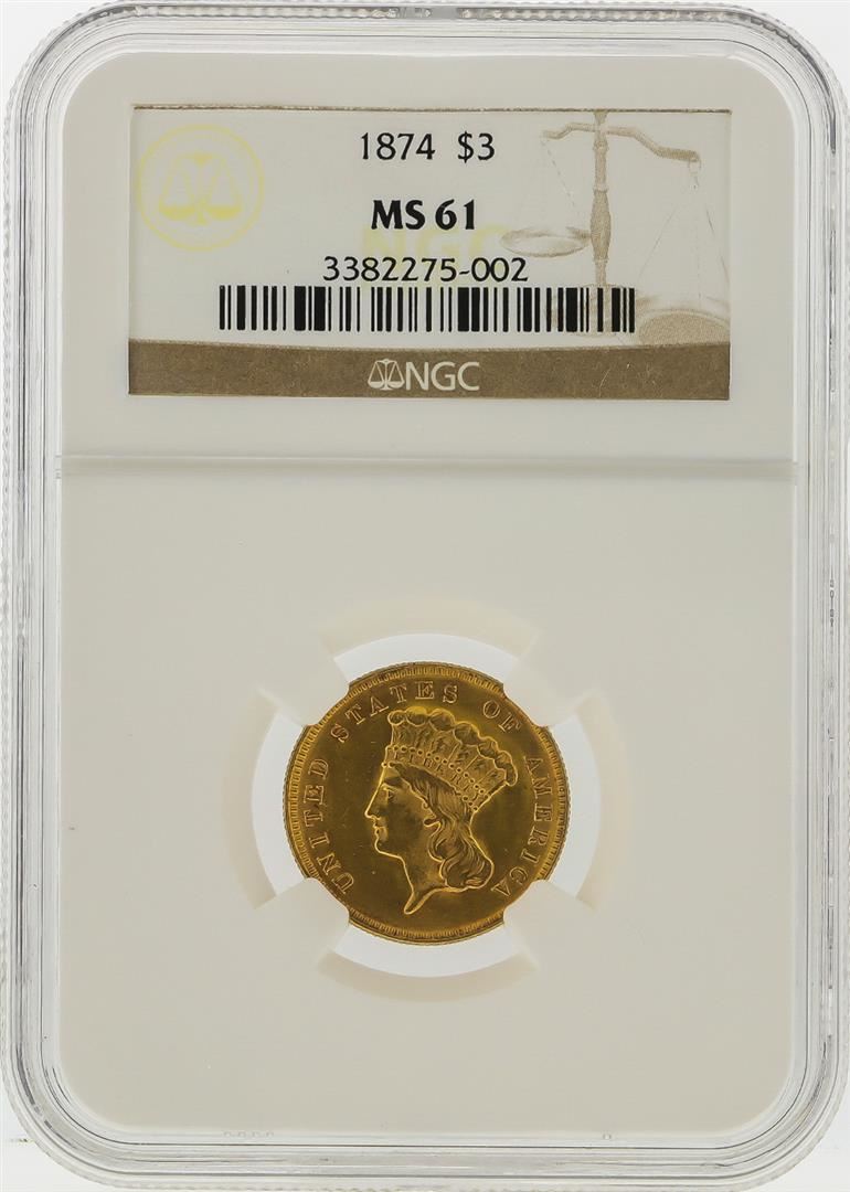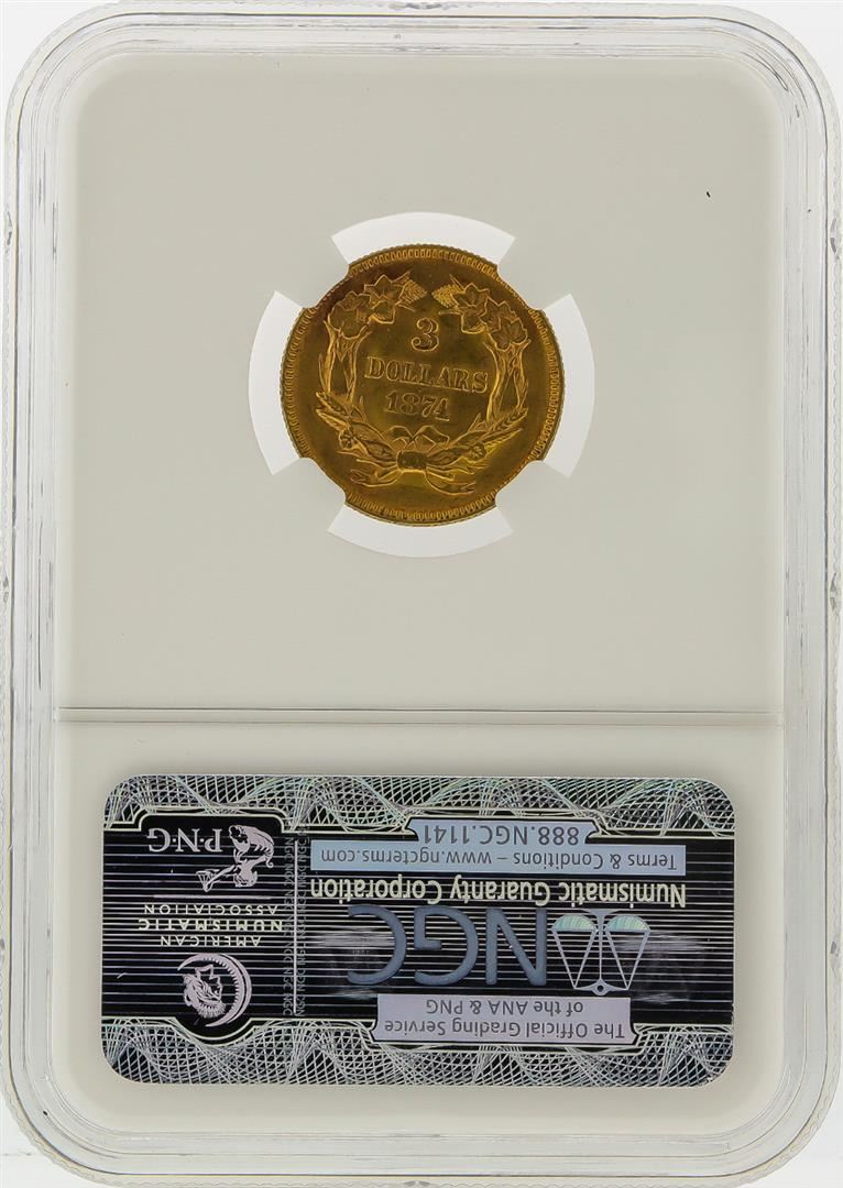 One 1874 $3 Indian Princess Head Gold Coin NGC MS61. NGC Certified.