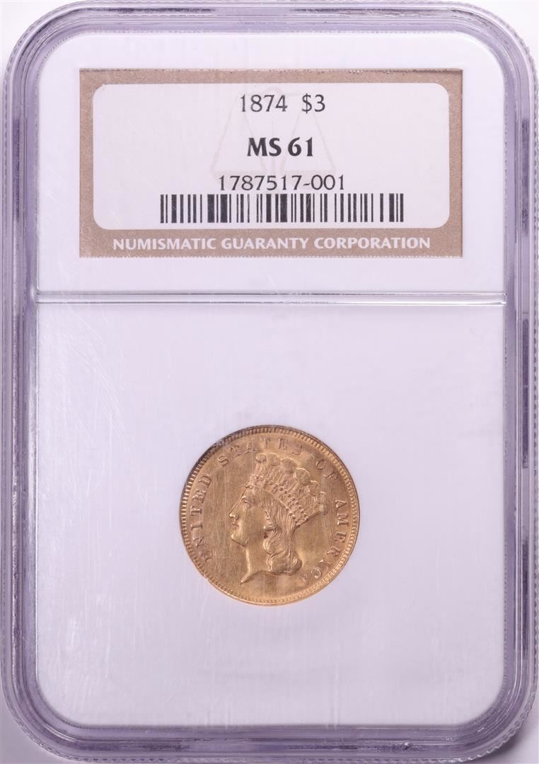 One 1874 $3 Indian Princess Head Gold Coin NGC MS61. NGC Certified.