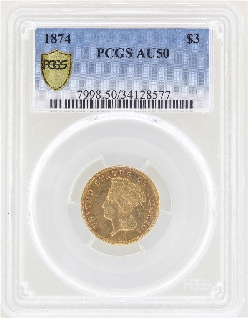 One 1874 $3 Indian Princess Head Gold Coin PCGS AU50. PCGS Graded.