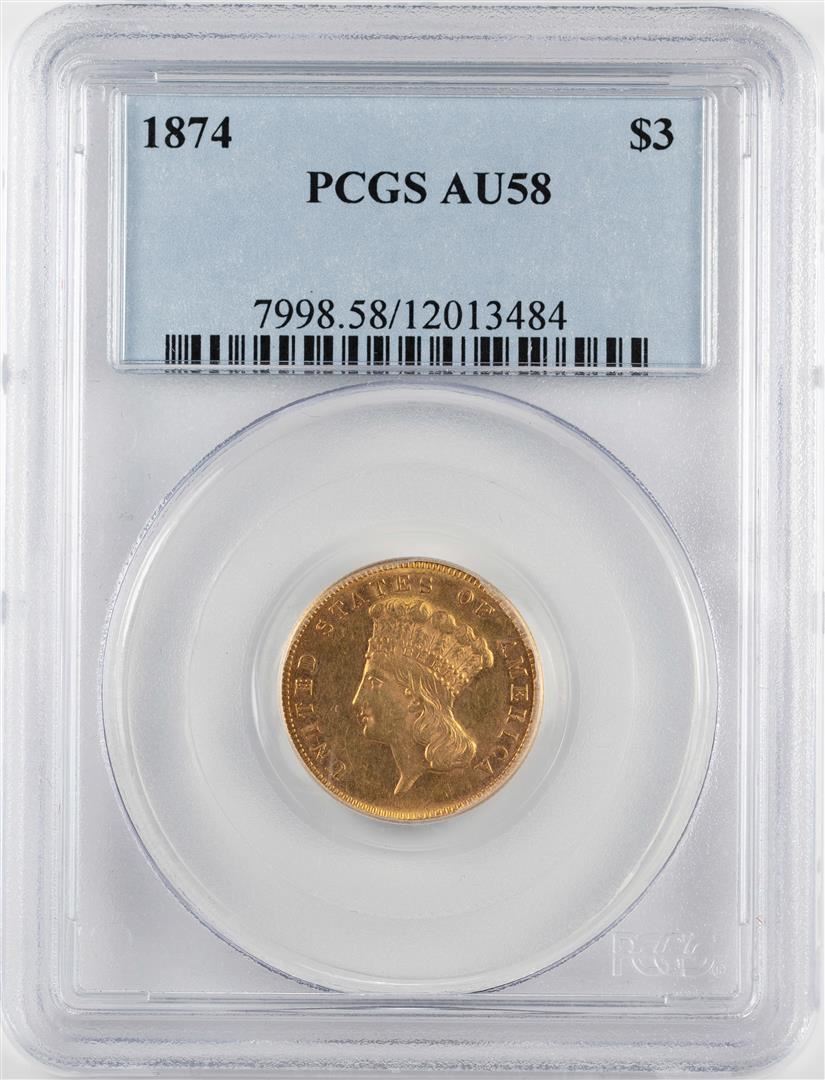 One 1874 $3 Indian Princess Head Gold Coin PCGS AU58. PCGS Graded.