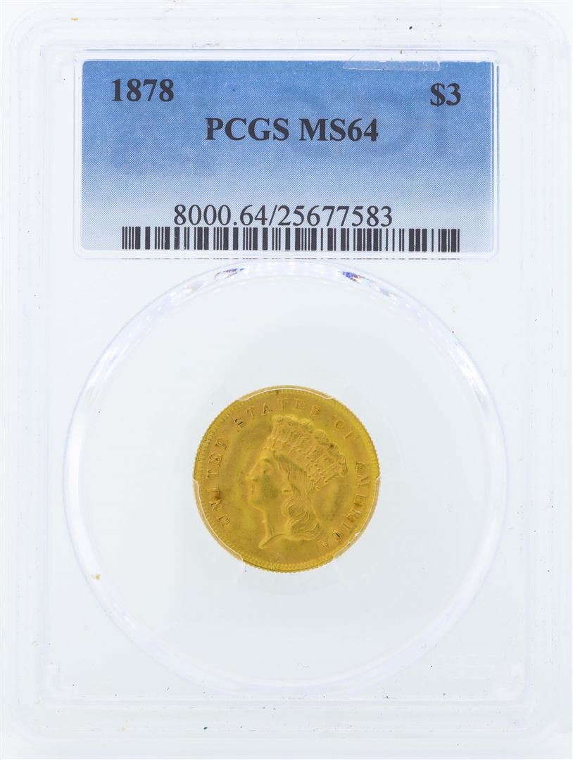 One 1874 $3 Indian Princess Head Gold Coin PCGS MS64. PCGS Graded.