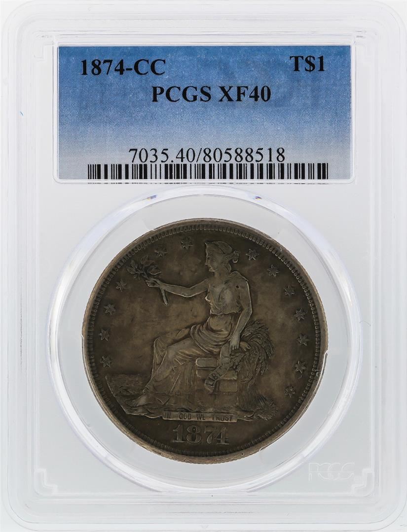 One 1874-CC $1 Silver Trade Dollar Coin PCGS XF40. PCGS Graded.