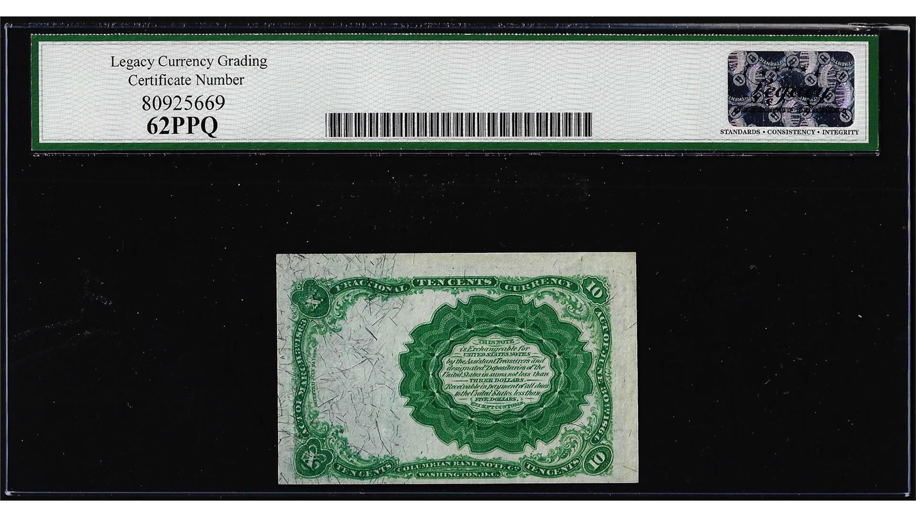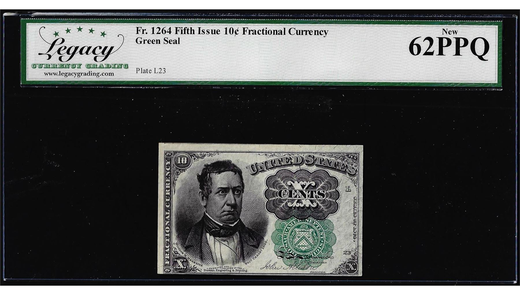 One 1874 Fifth Issue 10 Cent Fractional Currency Note Fr.1264 Legacy New 62PPQ. Legacy Graded.