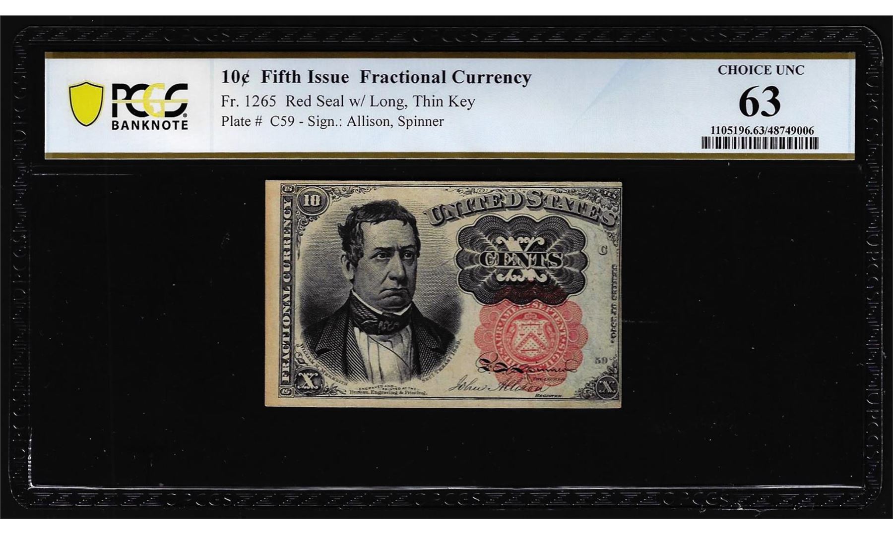 One 1874 Fifth Issue 10 Cents Fractional Currency Note Fr.1265 PCGS Choice Uncirculated 63. PCGS Graded.