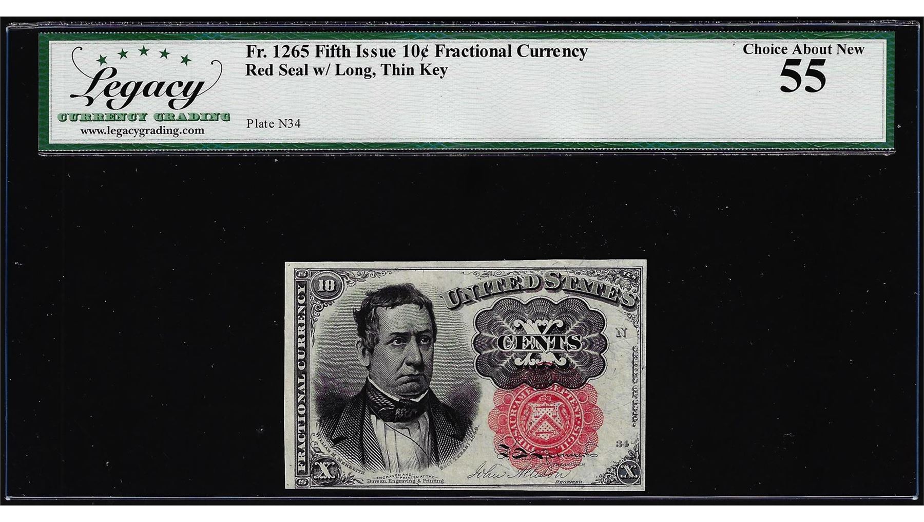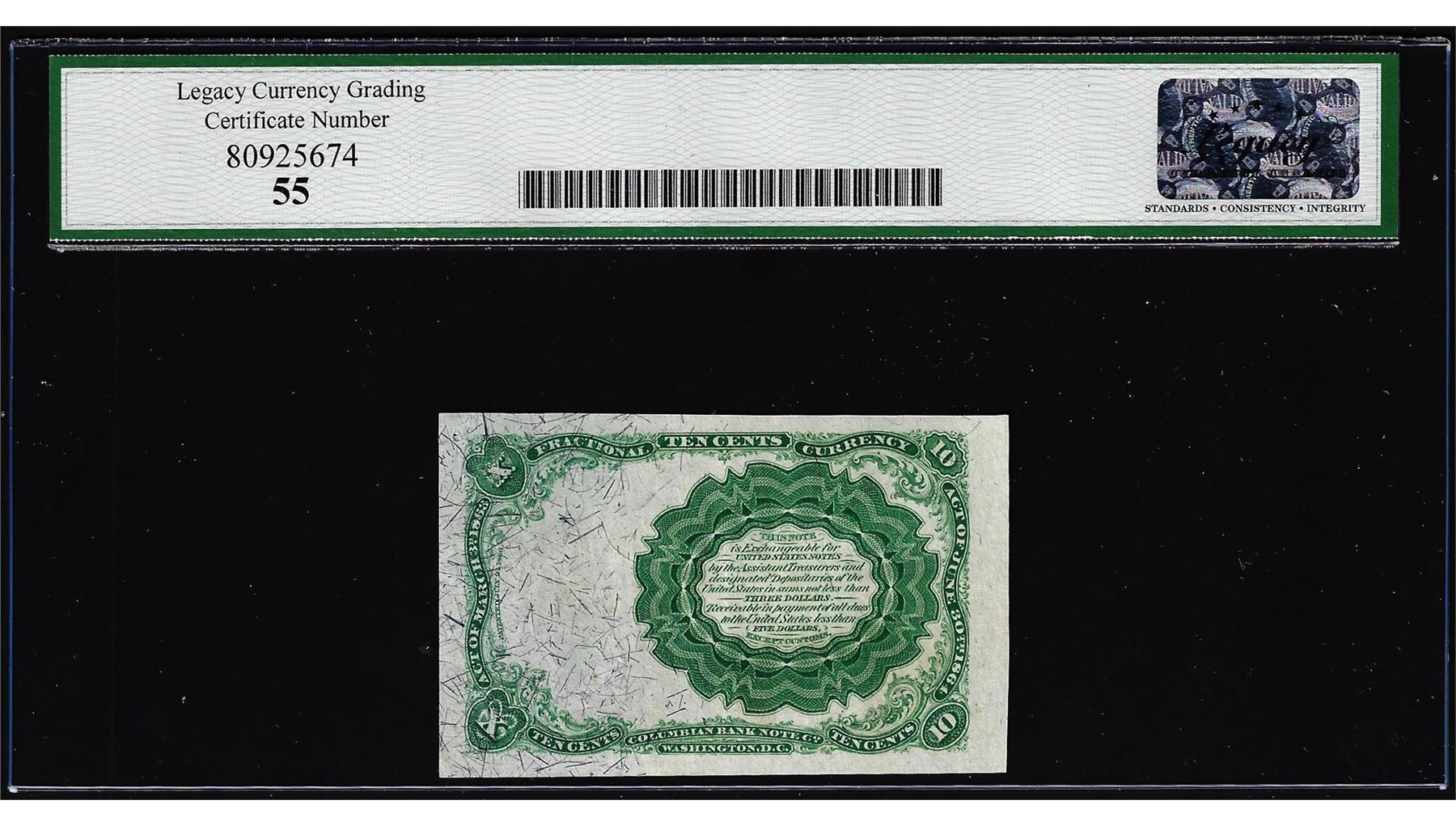 One 1874 Fifth Issue 10 Cents Fractional Note Fr.1265 Legacy Choice About New 55. Legacy Graded.