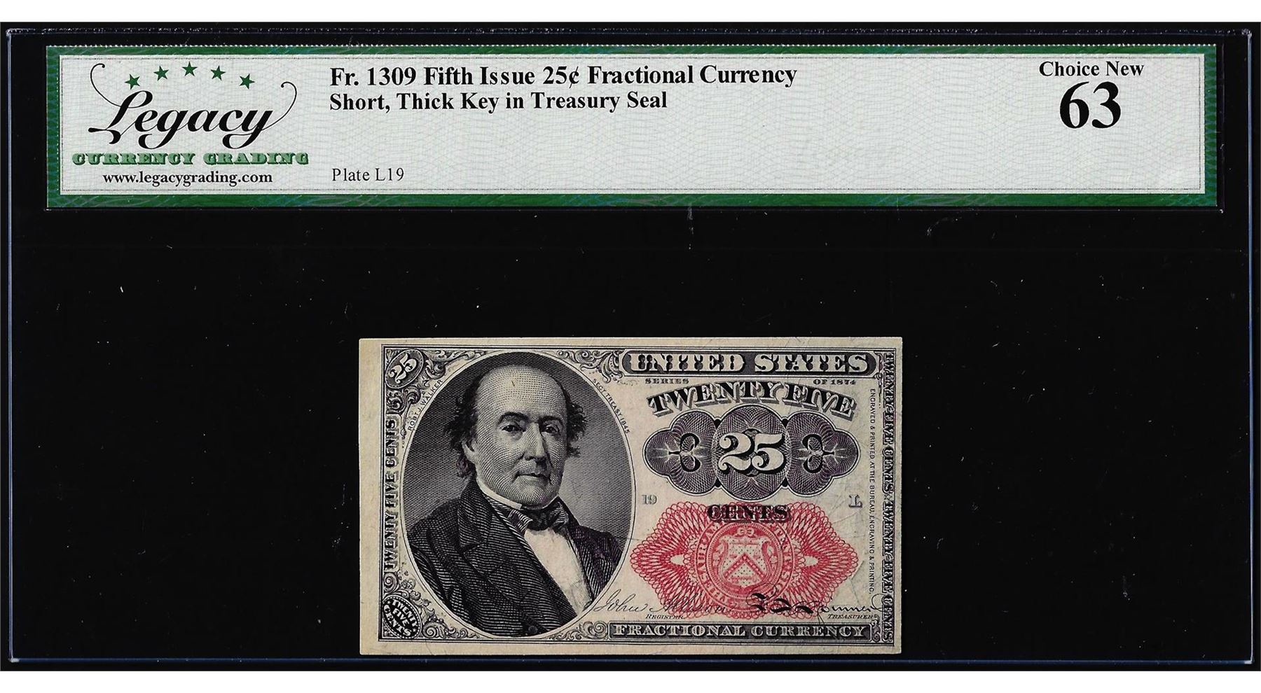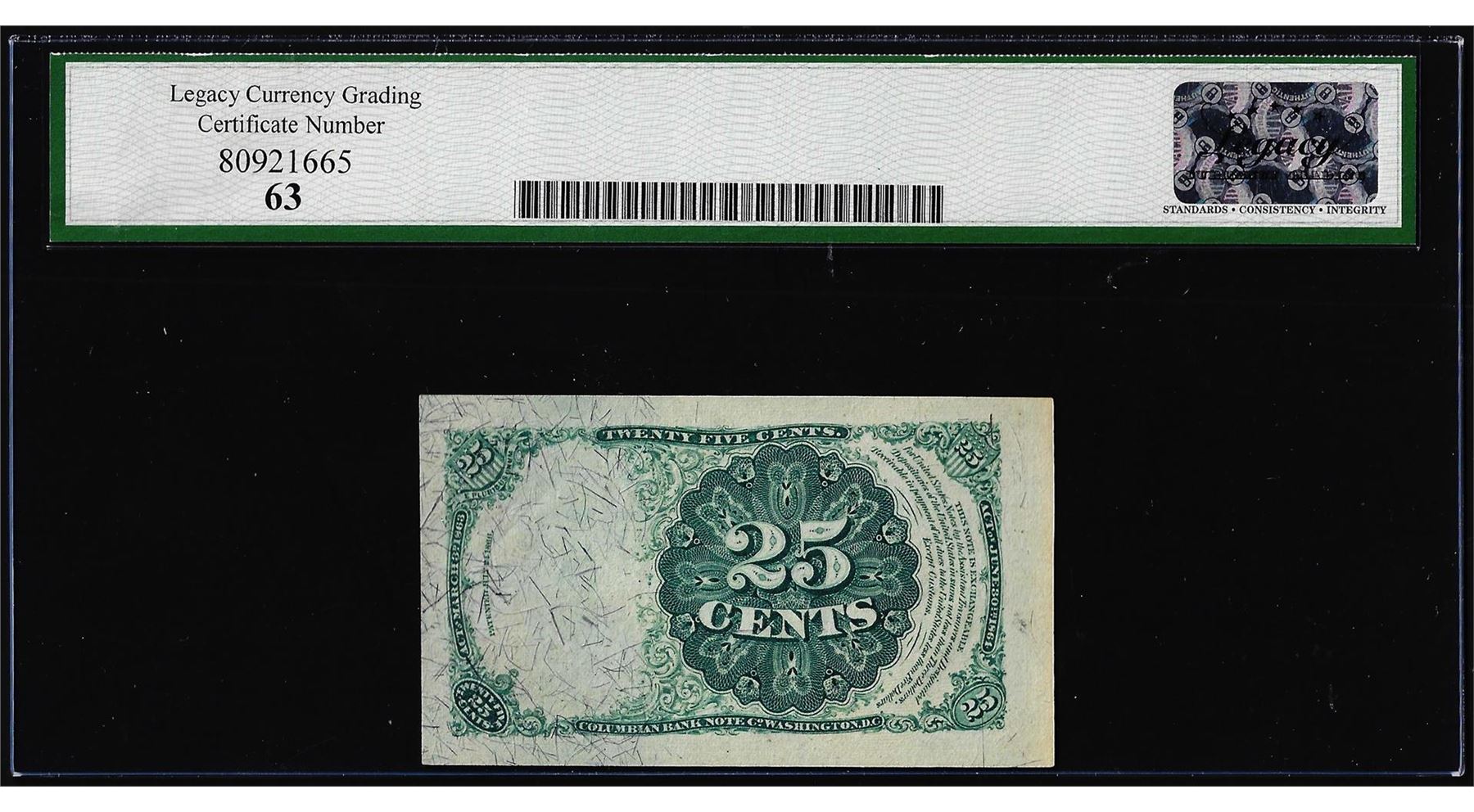 One 1874 Fifth Issue 25 Cent Fractional Currency Note Fr.1309 Legacy Choice New 63. Legacy Graded.