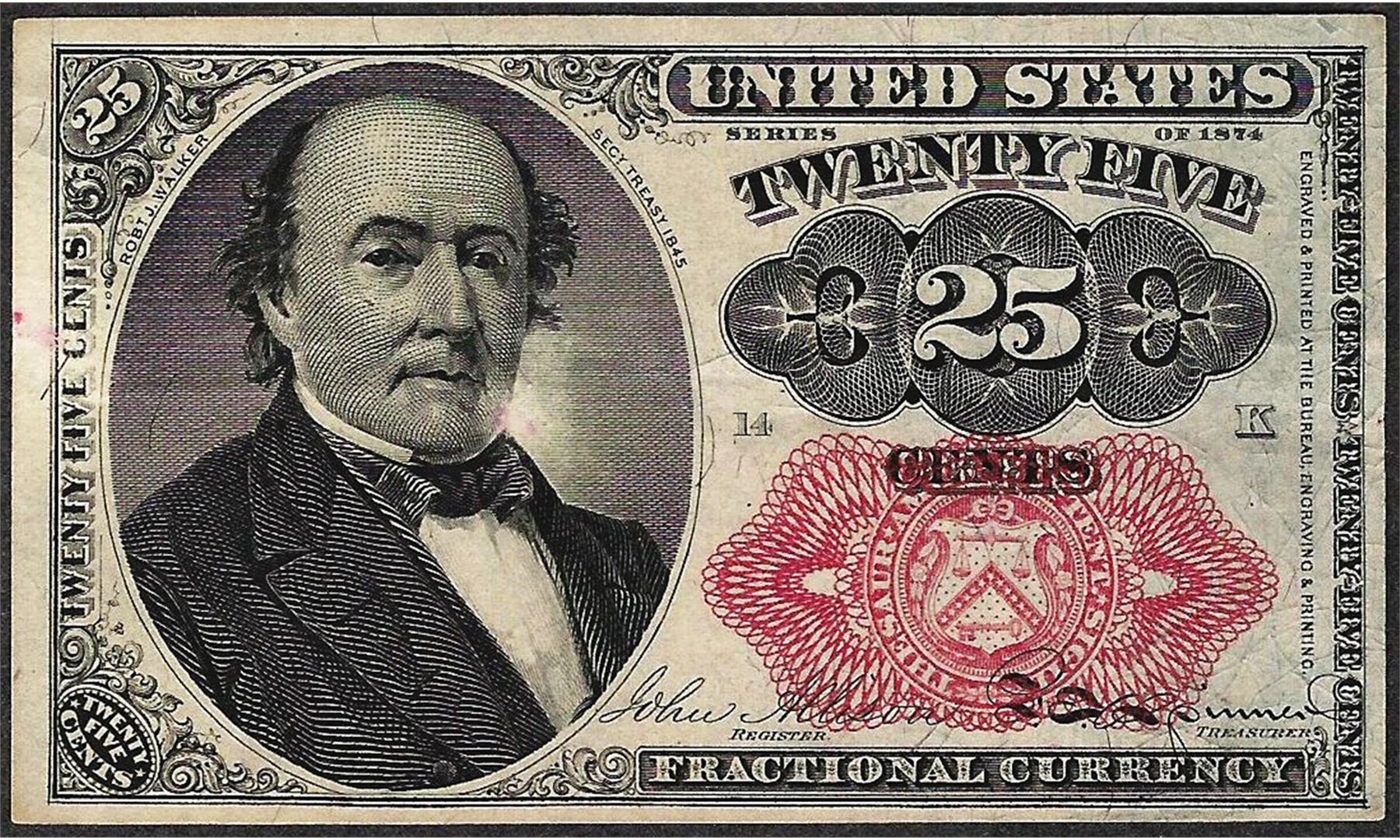 One 1874 Fifth Issue 25 Cent Fractional Currency Note.