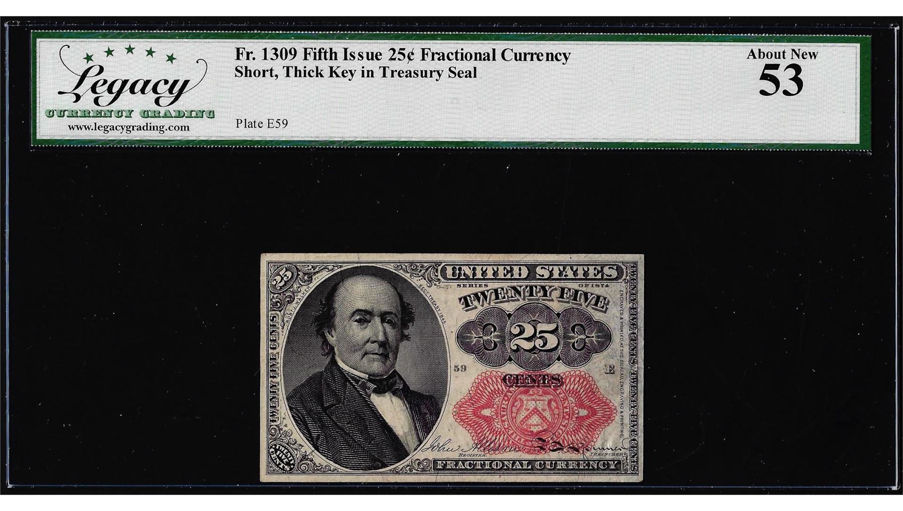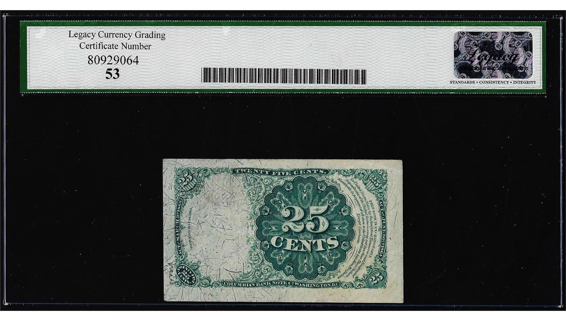 One 1874 Fifth Issue 25 Cents Fractional Currency Note Fr.1309 Legacy About New 53. Legacy Graded.