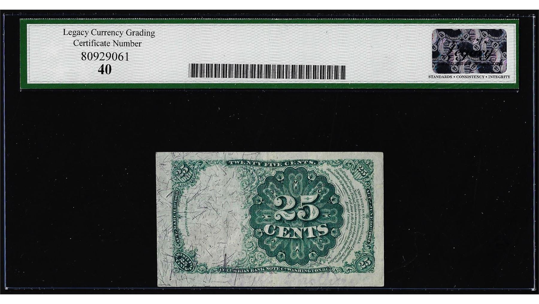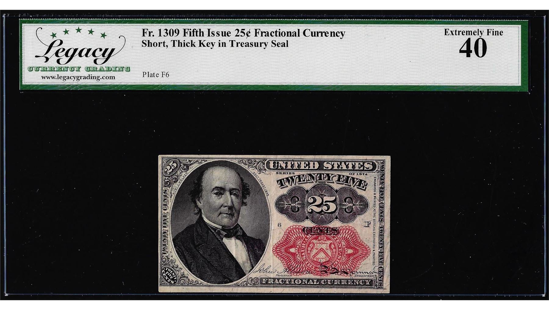 One 1874 Fifth Issue 25 Cents Fractional Currency Note Fr.1309 Legacy Extremely Fine 40. Legacy Graded.
