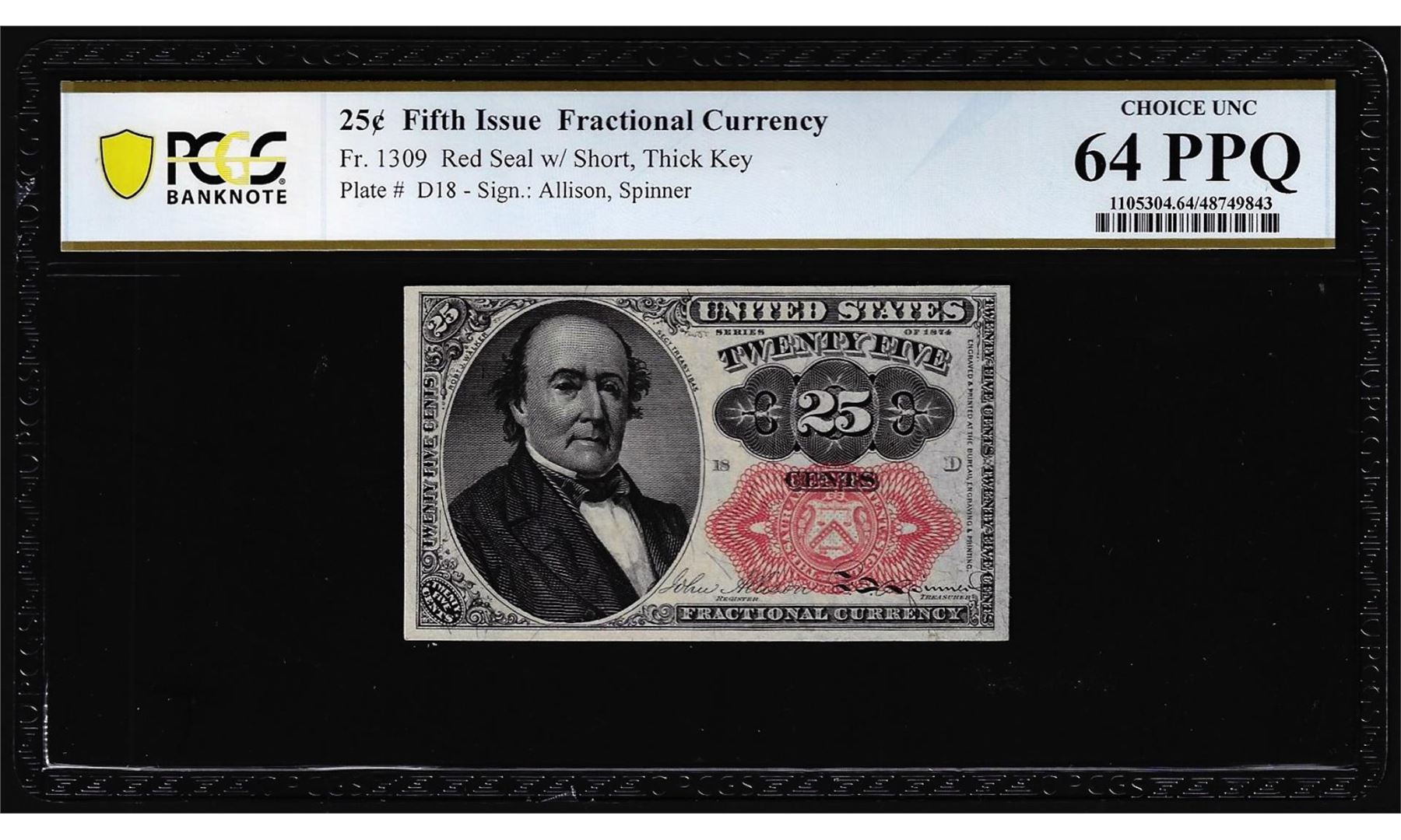 One 1874 Fifth Issue 25 Cents Fractional Currency Note Fr.1309 PCGS Choice Unc 64PPQ. PCGS Graded.
