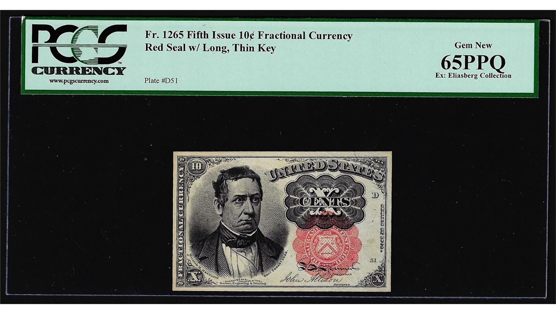 One 1874 Fifth Issue Ten Cent Fractional Currency Note Fr.1265 PCGS Gem New 65PPQ. PCGS Graded.