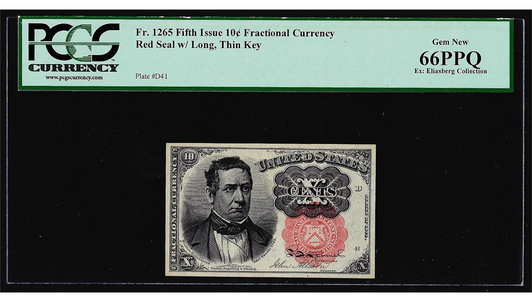 One 1874 Fifth Issue Ten Cent Fractional Currency Note Fr.1265 PCGS Gem New 66PPQ. PCGS Graded.