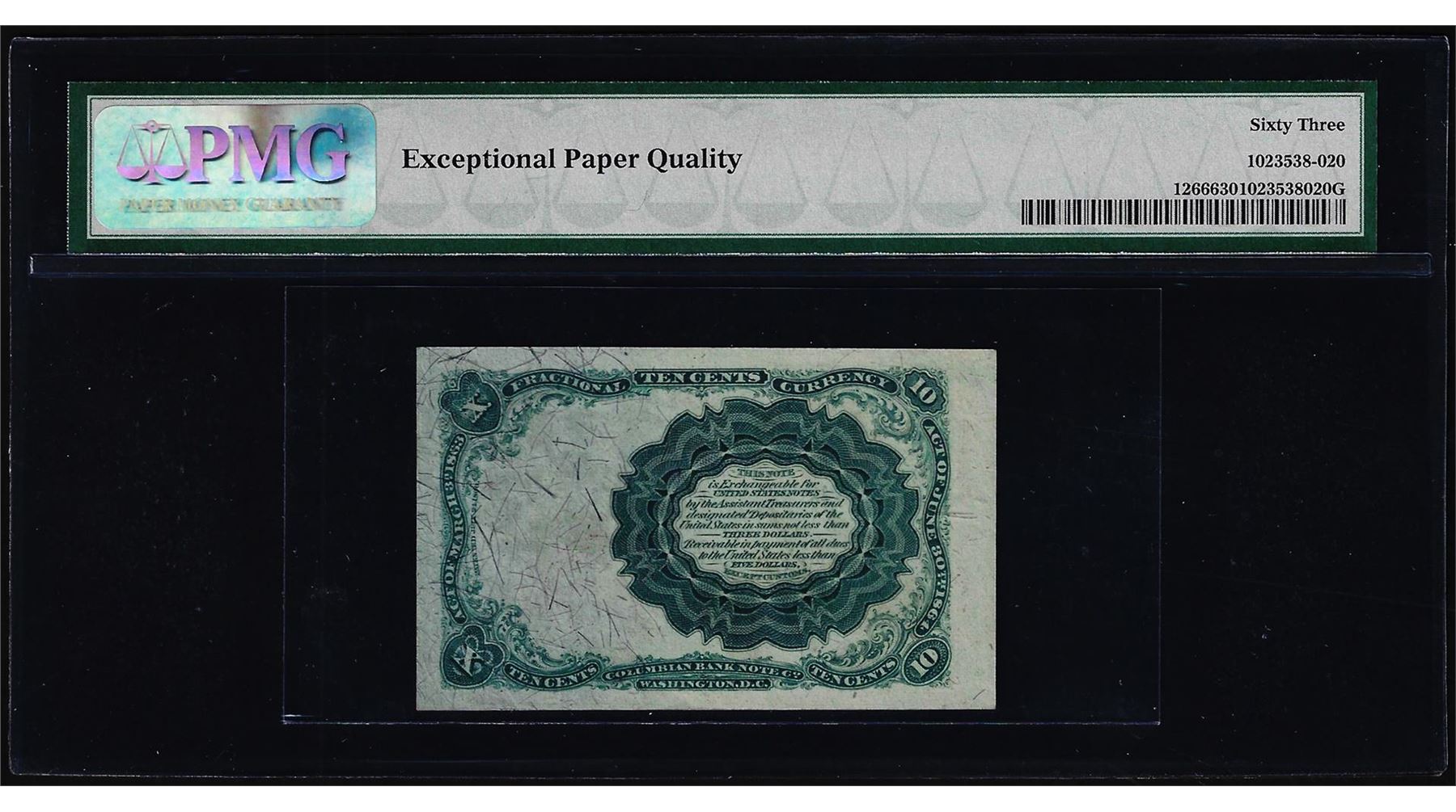One 1874 Fifth Issue Ten Cent Fractional Currency Note Fr.1266 PMG Ch. Uncirculated 63EPQ. PMG Certified.