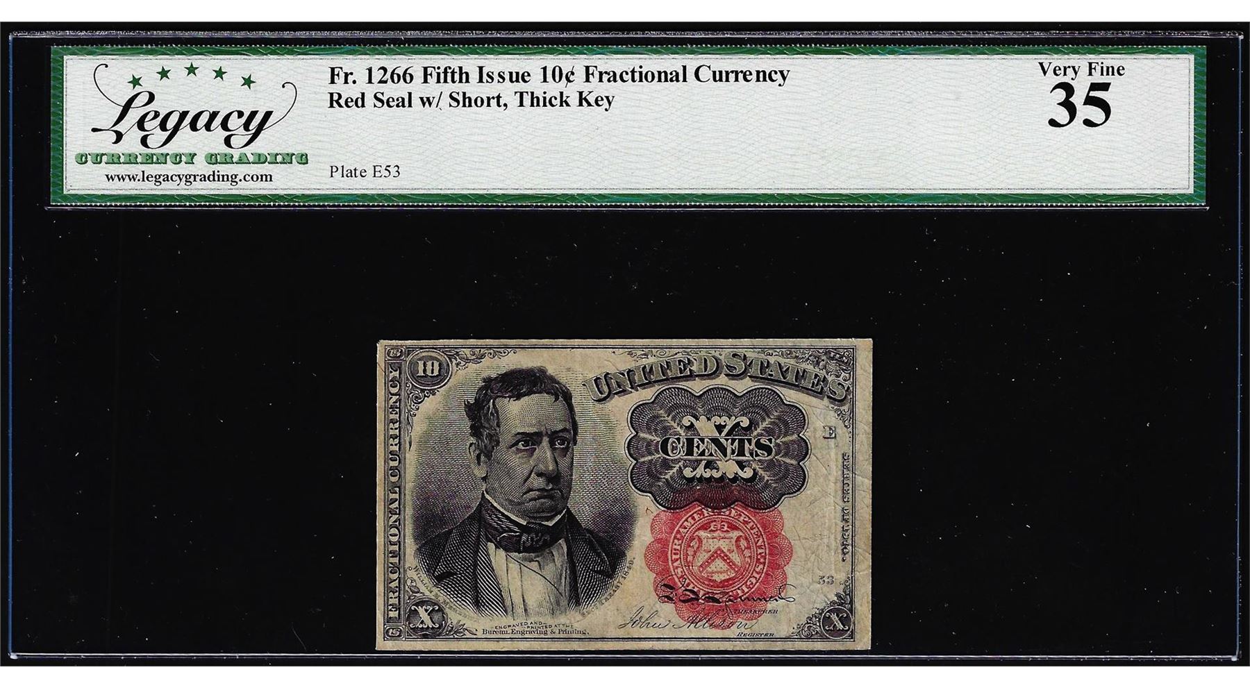 One 1874 Fifth Issue Ten Cents Fractional Currency Note Fr.1266 Legacy Very Fine 35. Legacy Graded.