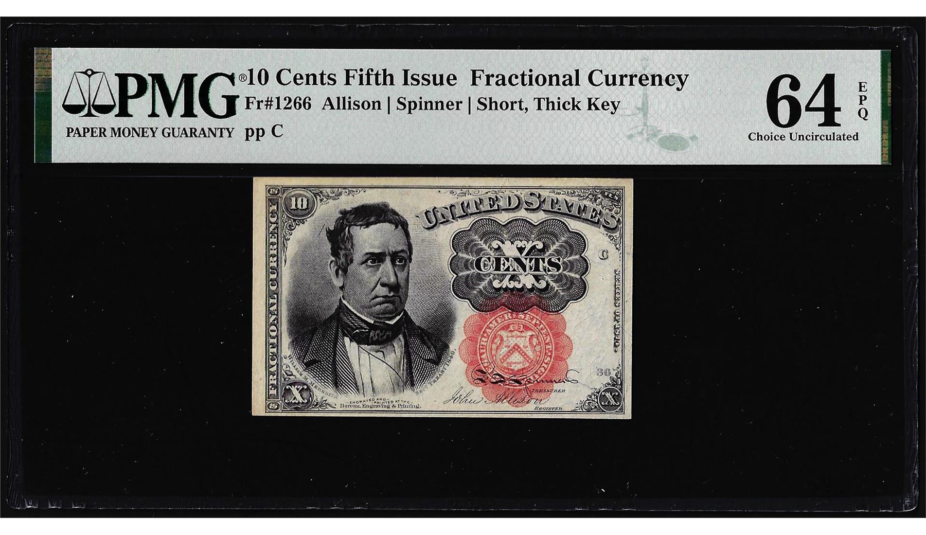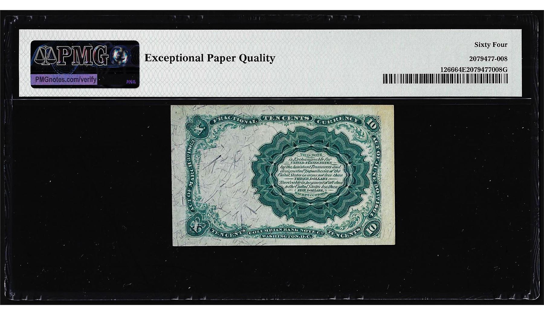 One 1874 Fifth Issue Ten Cents Fractional Currency Note Fr.1266 PMG Choice Uncirculated 64EPQ. PMG Certified.