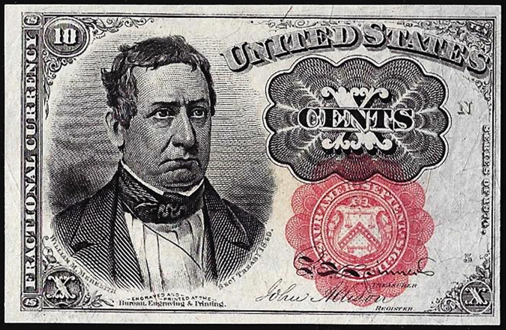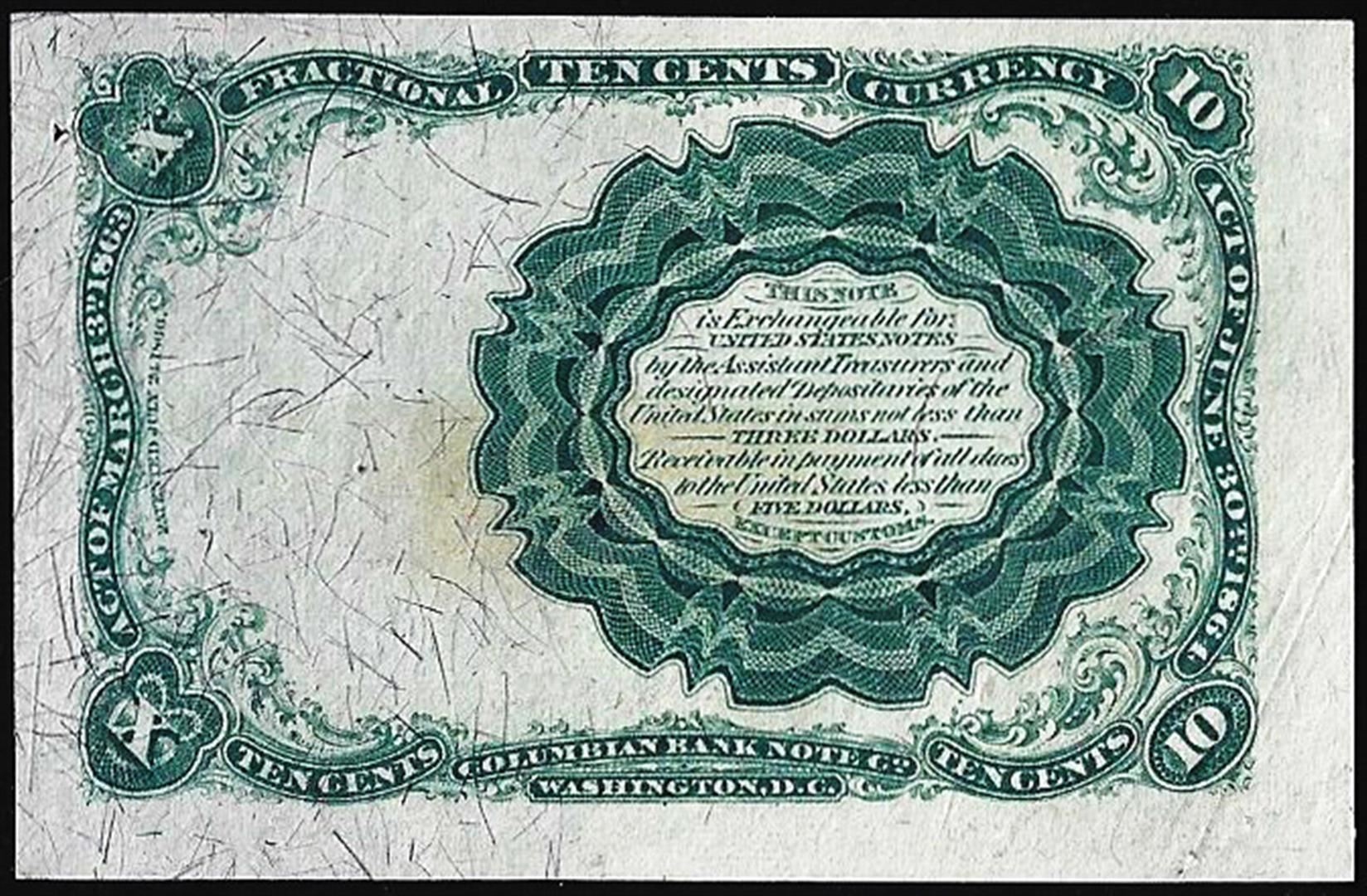 One 1874 Fifth Issue Ten Cents Fractional Currency Note.