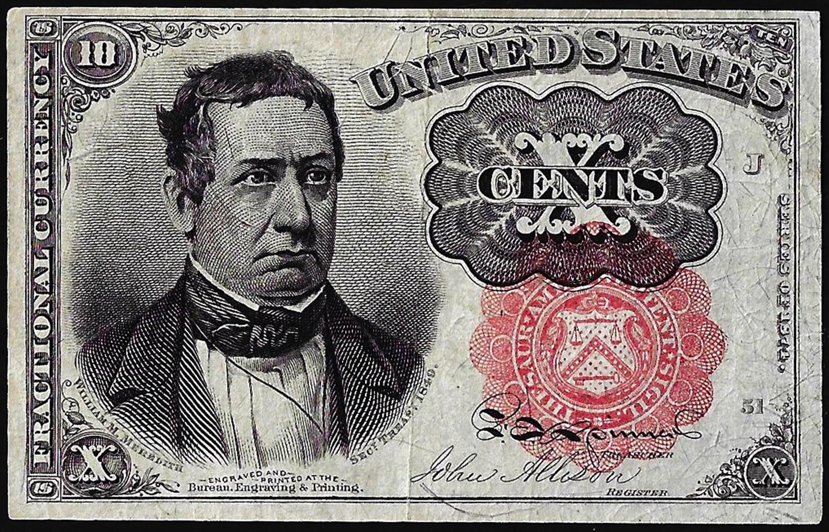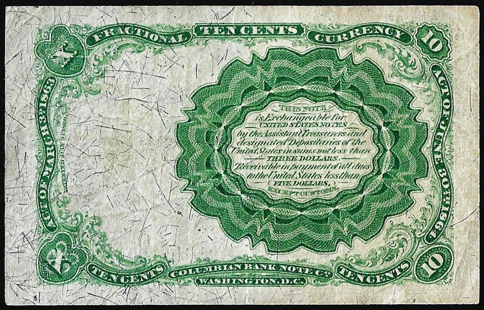 One 1874 Fifth Issue Ten Cents Fractional Currency Note.