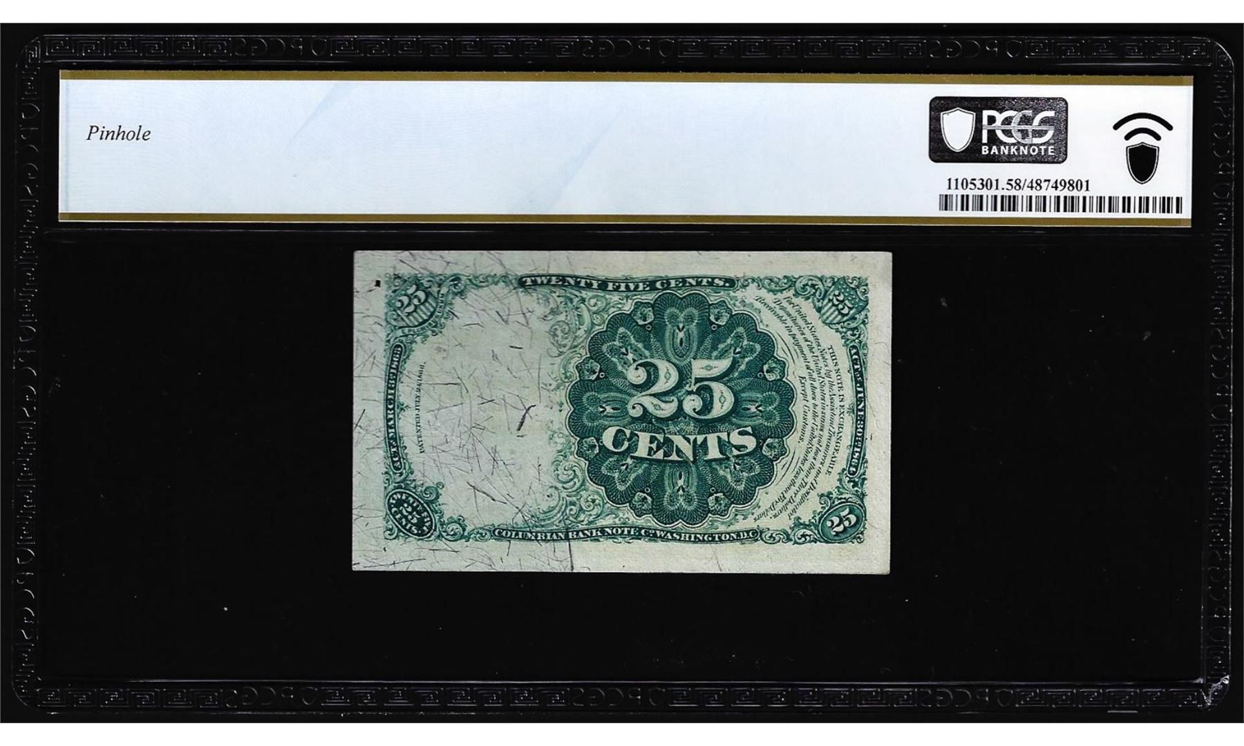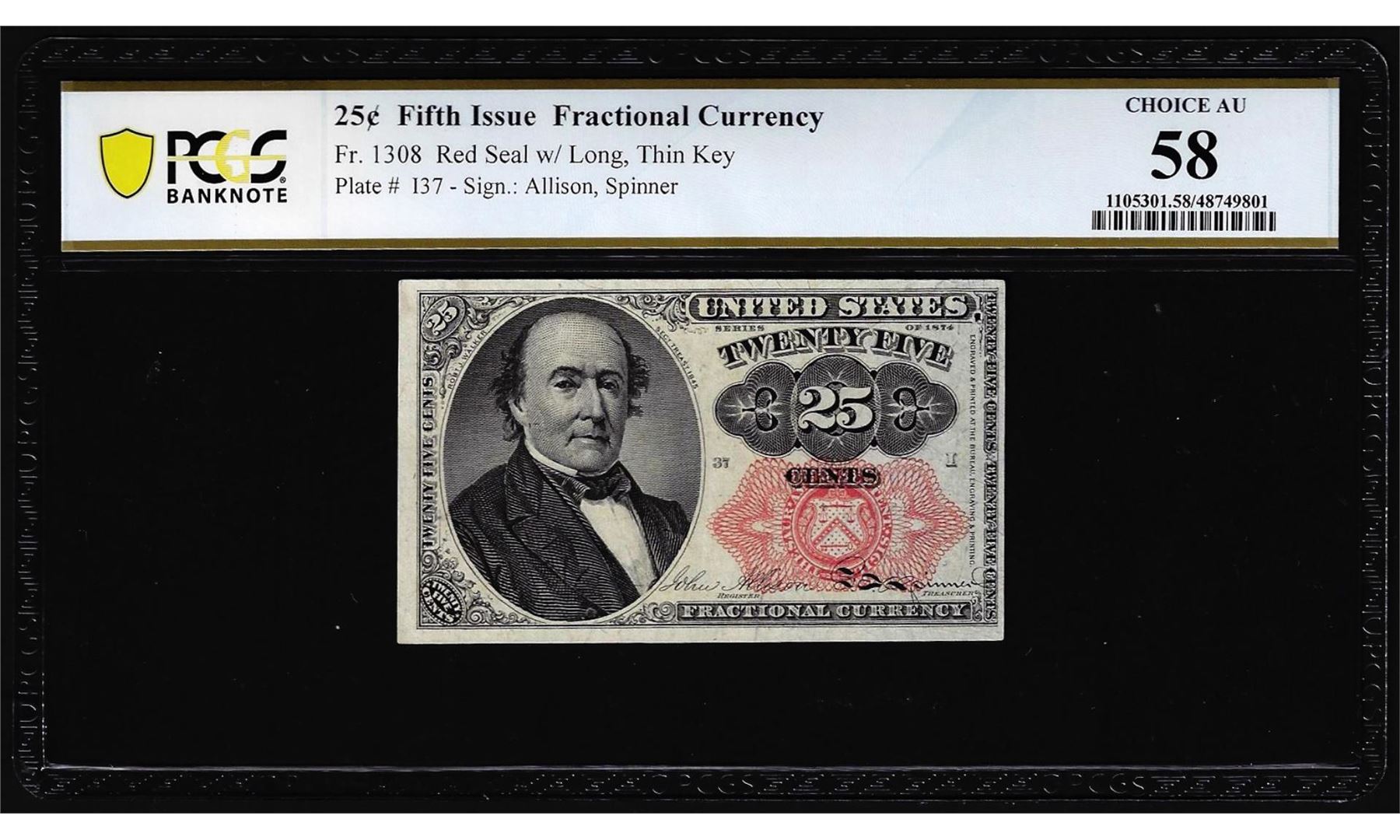 One 1874 Fifth Issue Twenty-Five Cents Fractional Currency Note Fr.1308 PCGS Choice AU58. PCGS Graded.