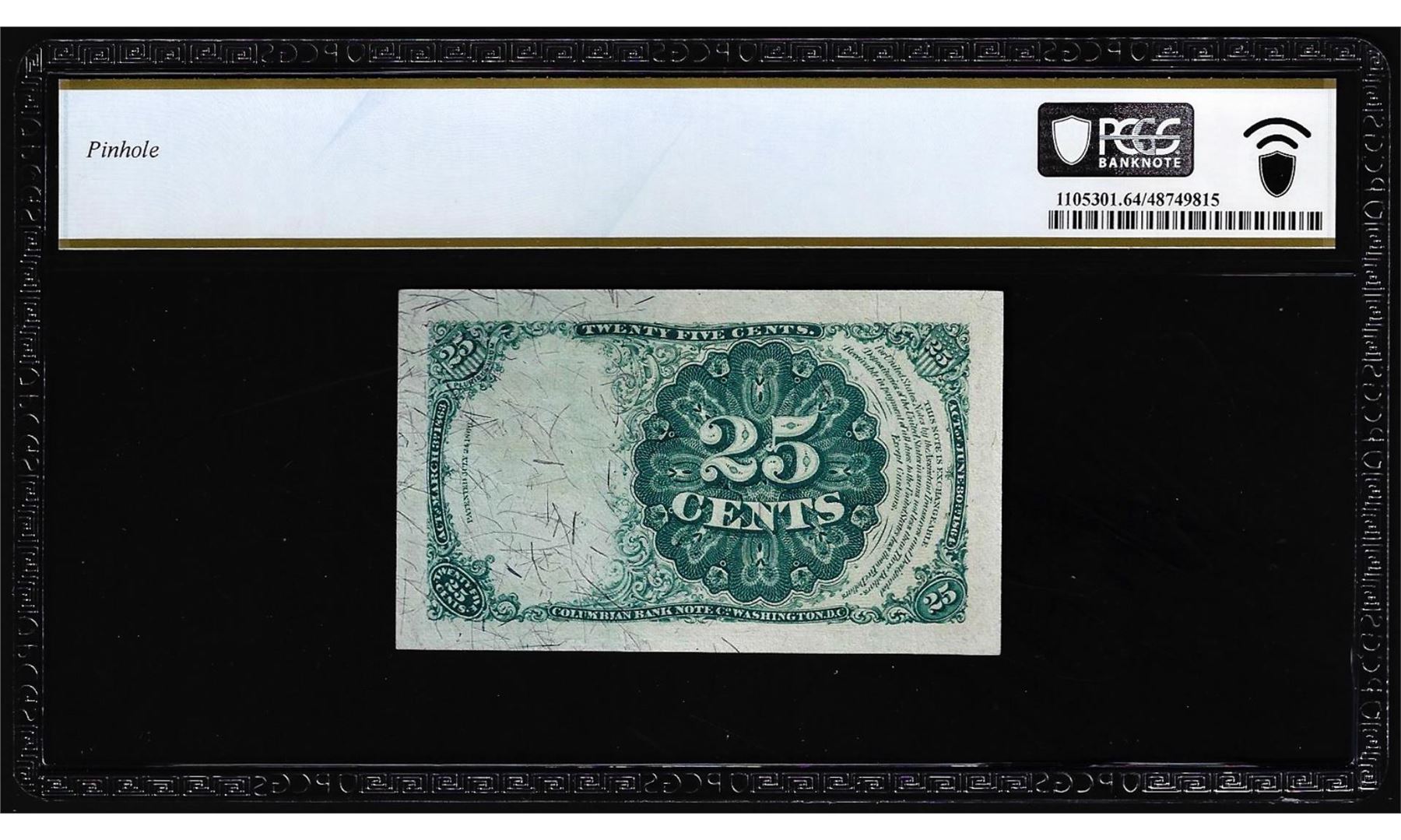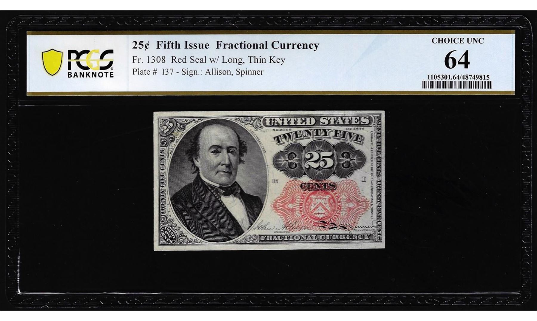 One 1874 Fifth Issue Twenty-Five Cents Fractional Currency Note Fr.1308 PCGS Choice Unc 64. PCGS Graded.