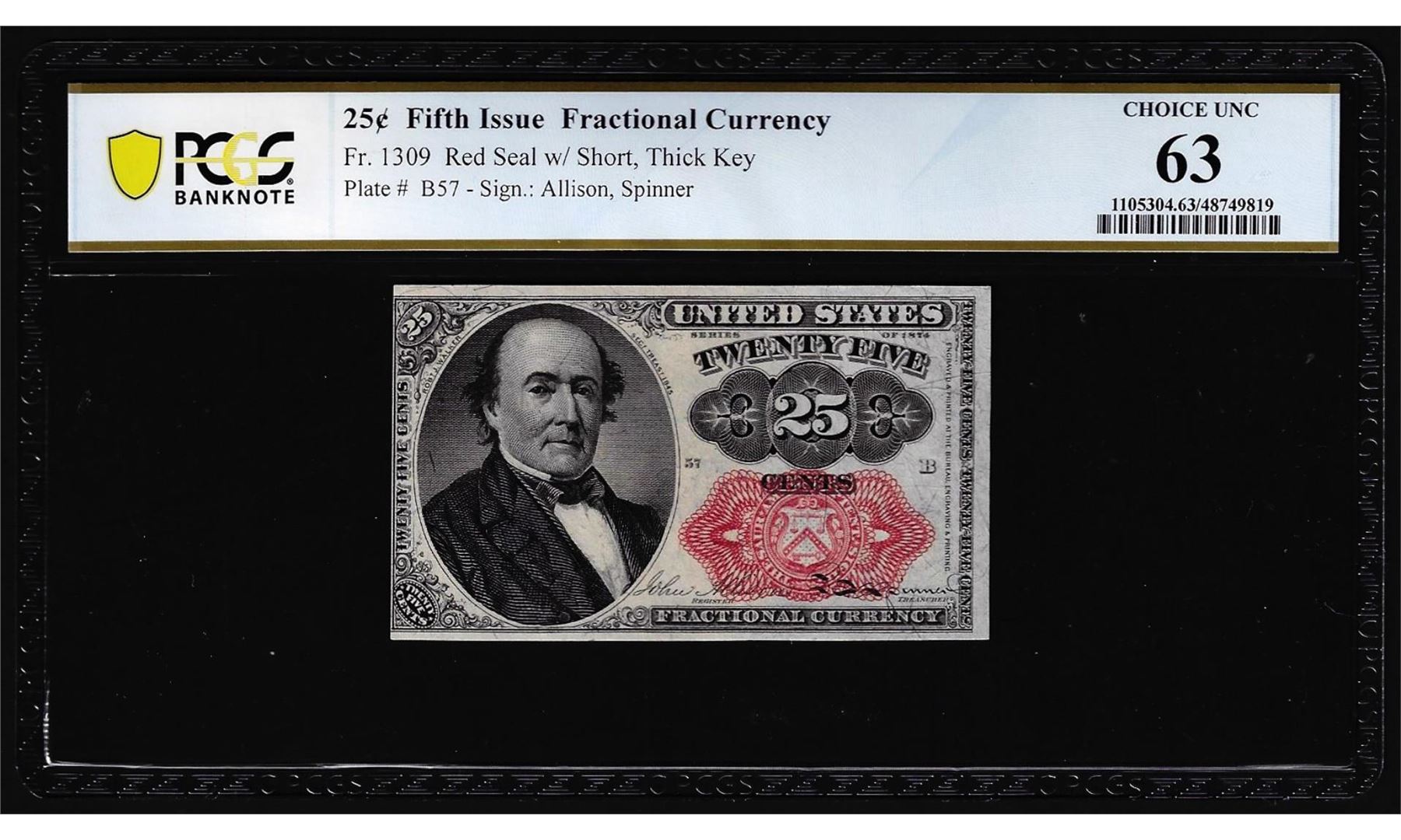 One 1874 Fifth Issue Twenty-Five Cents Fractional Currency Note Fr.1309 PCGS Choice Unc 63. PCGS Graded.