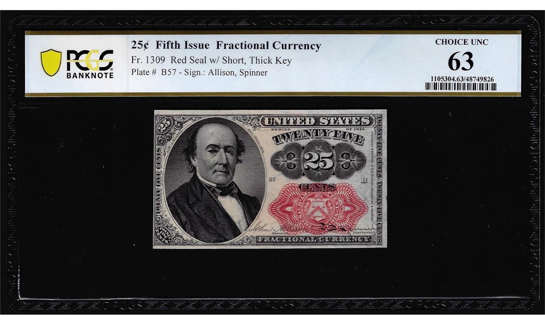 One 1874 Fifth Issue Twenty-Five Cents Fractional Currency Note Fr.1309 PCGS Choice Unc 63. PCGS Graded.
