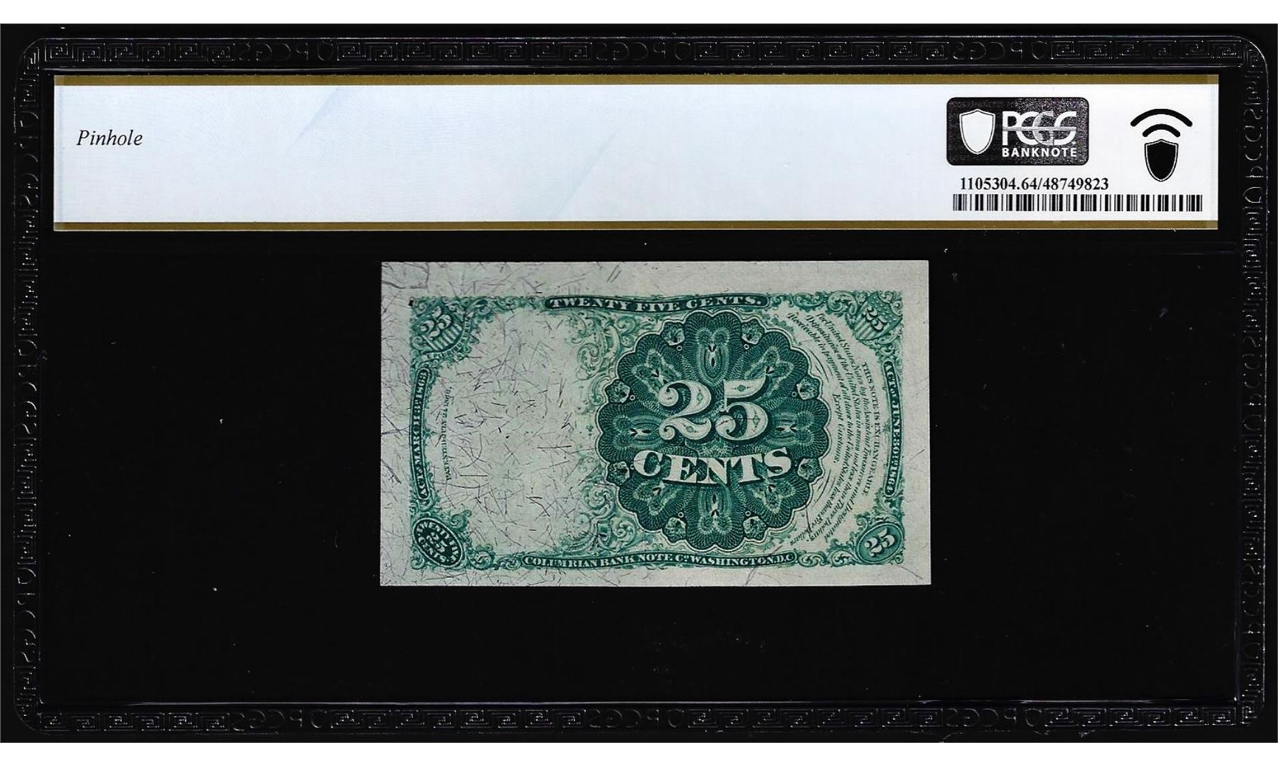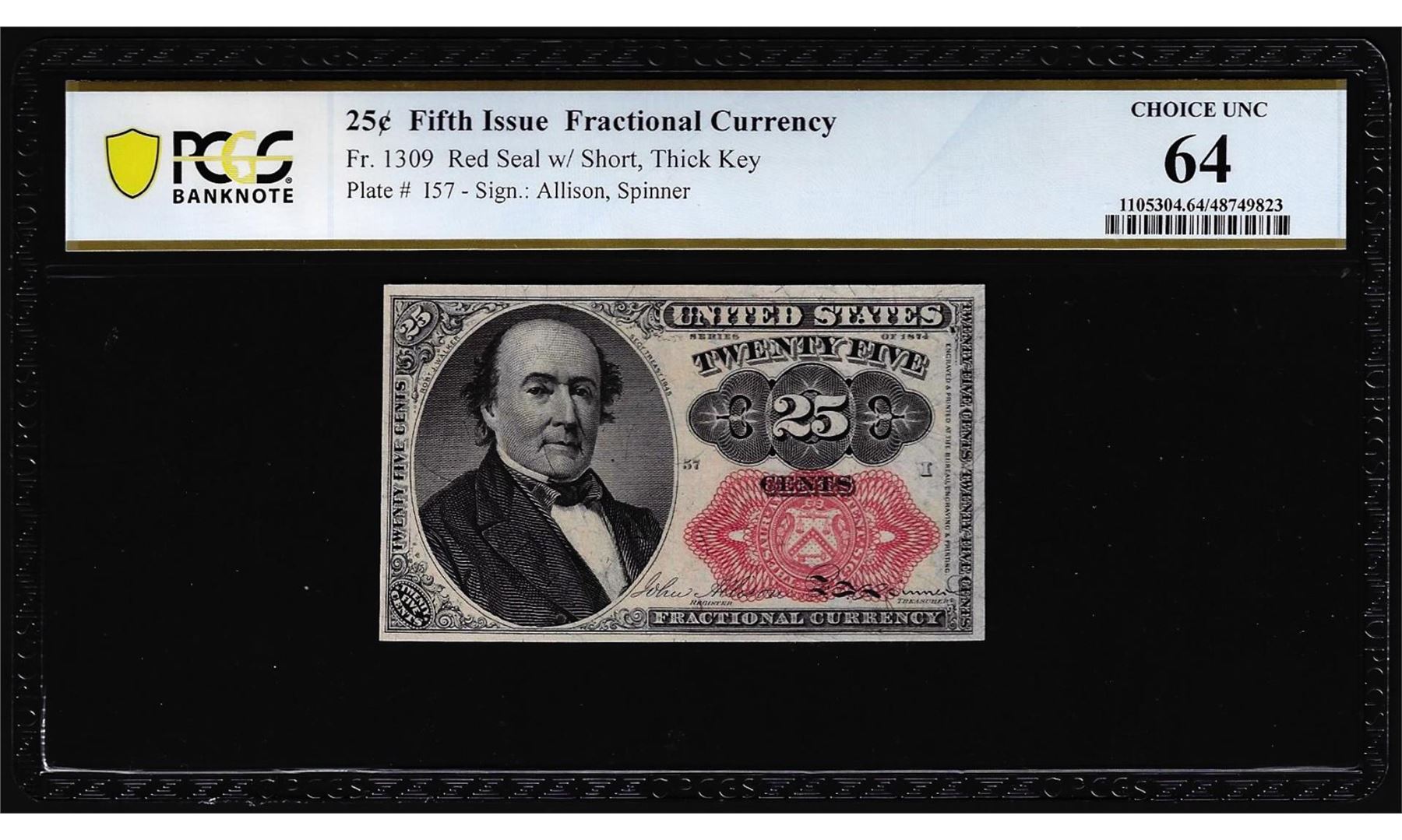 One 1874 Fifth Issue Twenty-Five Cents Fractional Currency Note Fr.1309 PCGS Choice Unc 64. PCGS Graded.