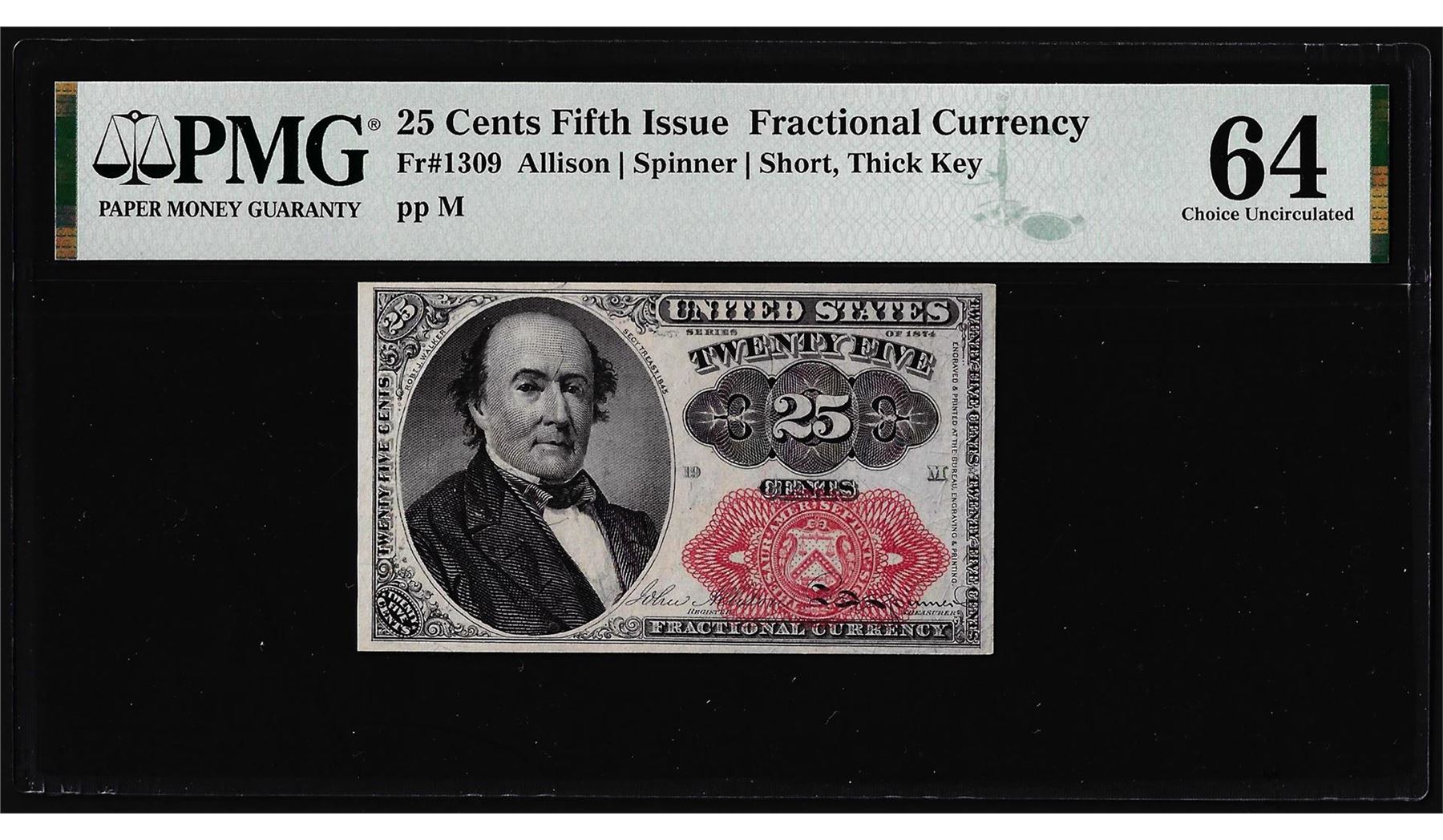 One 1874 Fifth Issue Twenty-Five Cents Fractional Note Fr.1309 PMG Choice Uncirculated 64. PMG Certified.