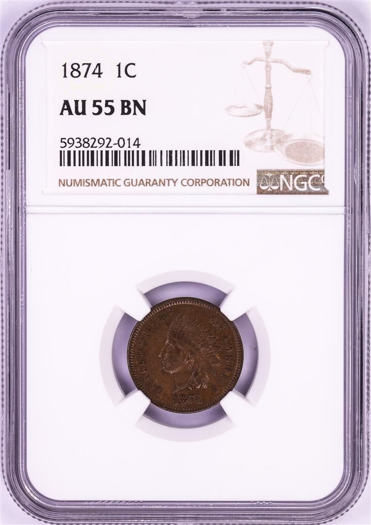 One 1874 Indian Head Cent Coin NGC AU55BN. NGC Certified.