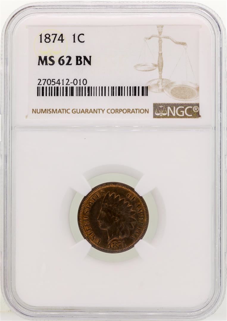One 1874 Indian Head Cent Coin NGC MS62 BN. NGC Certified.