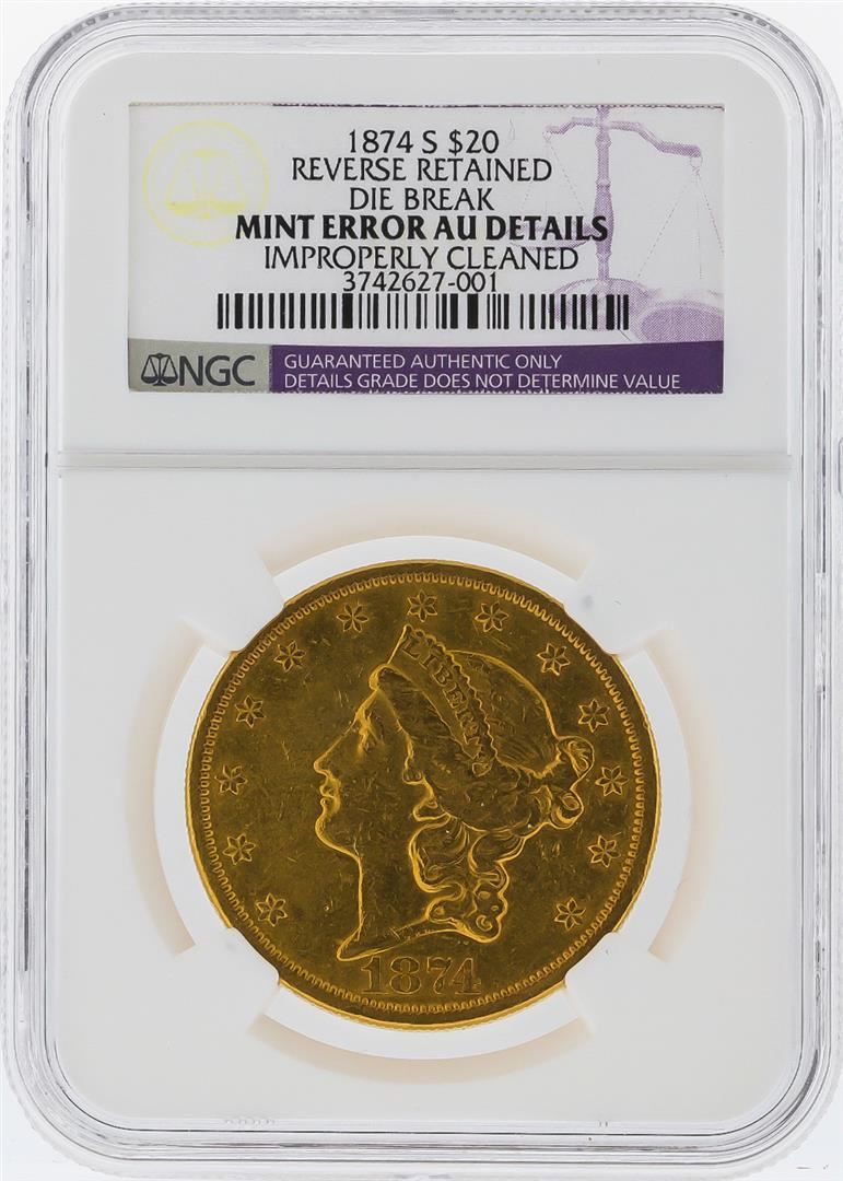 One 1874-S $20 Liberty Head Double Eagle Gold Coin Reverse Retained Die Break Mint ERROR NGC graded AU Details. NGC Certified.