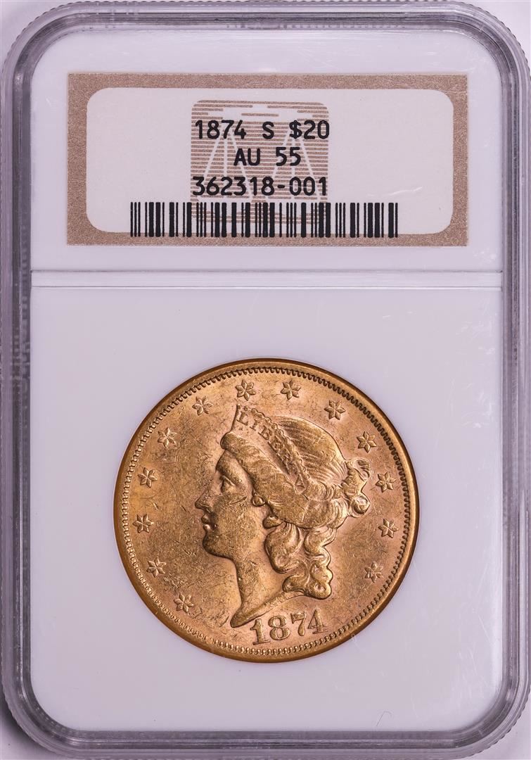 One 1874-S $20 Liberty Head Double Eagle Gold Coin NGC AU55. NGC Certified.