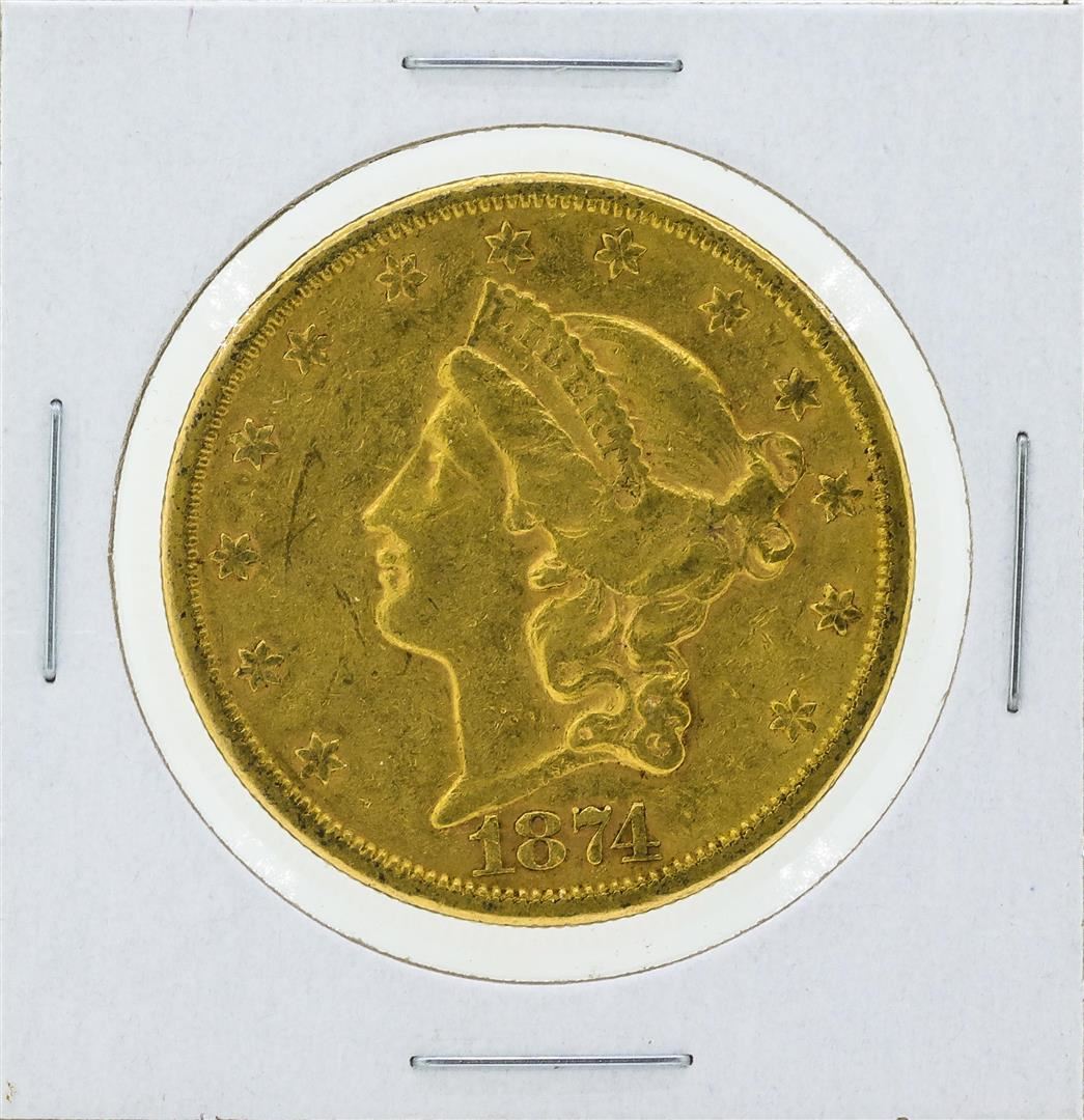 One 1874-S $20 Liberty Head Double Eagle Gold Coin.