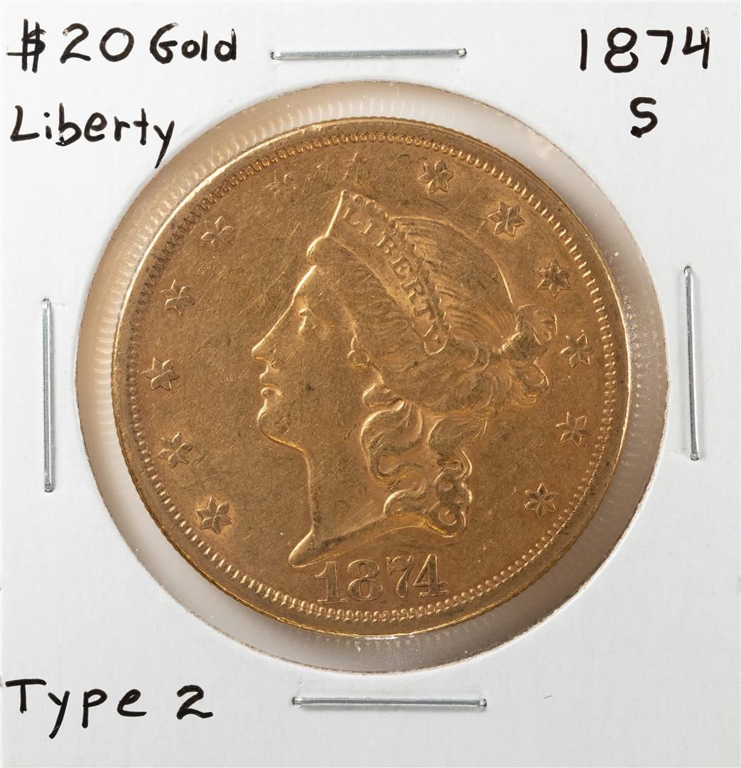 One 1874-S $20 Liberty Head Double Eagle Gold Coin.